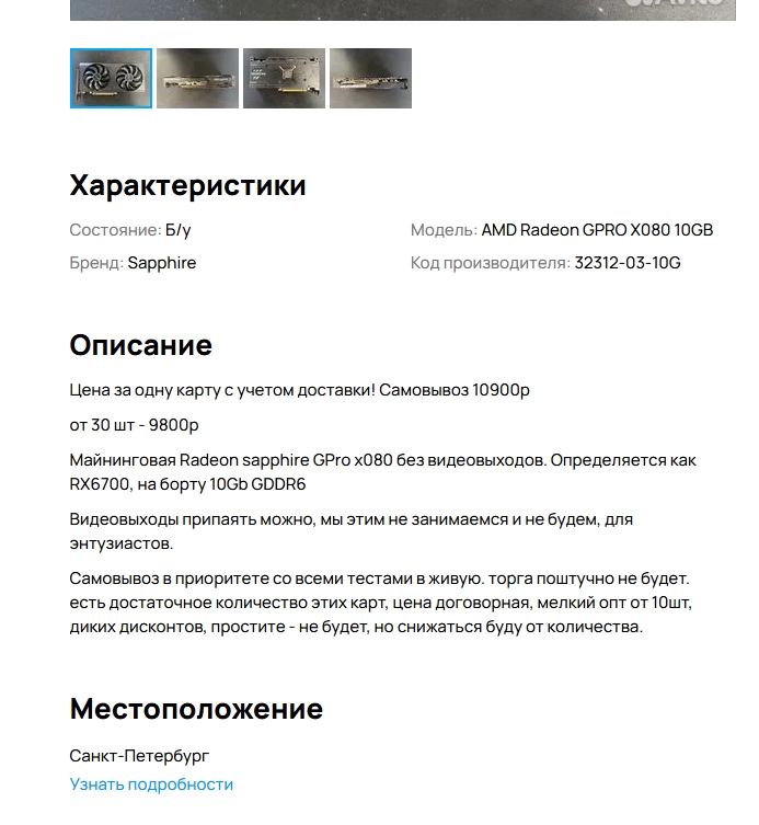 Sapphire gpro X080 12-13к , майнинг 6700 амуда, по производительности аналог 3070м. Прошивается в обычную 6700, драйвера без патча, но нет видеовыхода. Допаять видеовыход возможно, но паять нужно все, сам разъем, всю обвязку с конденсаторами, резисторами, преобразователями, от чего выгодней использовать по аналогии с п106\цмп.