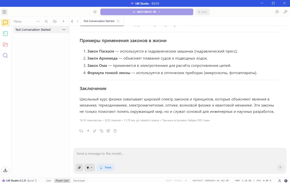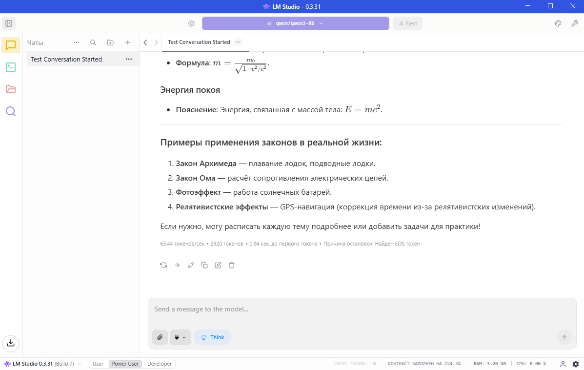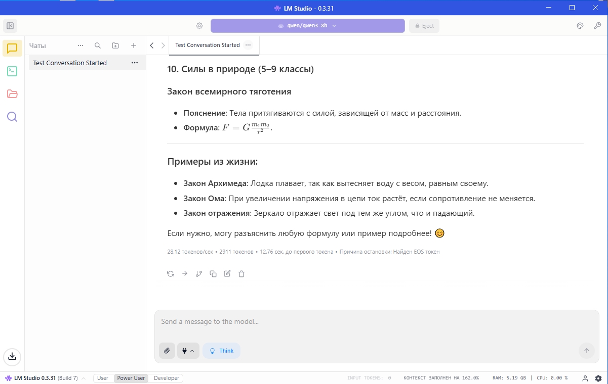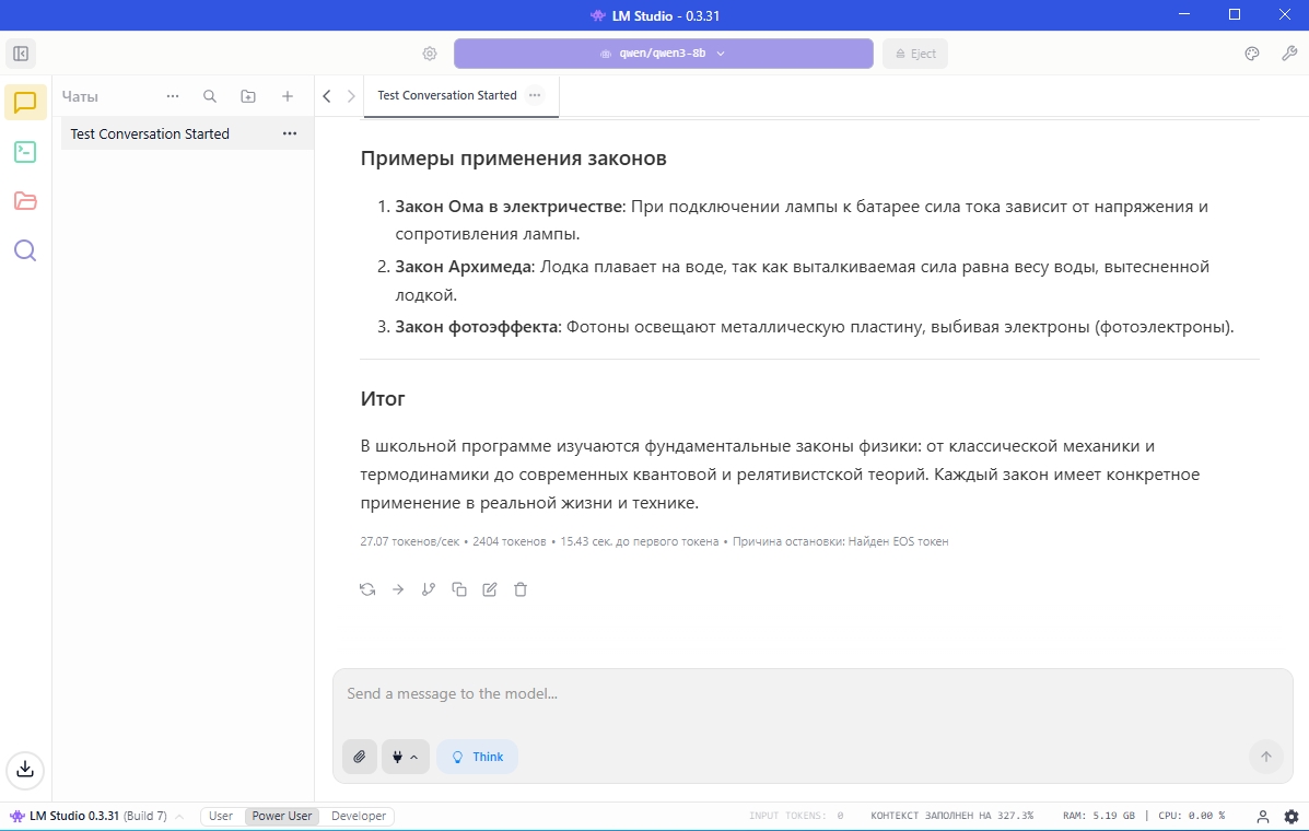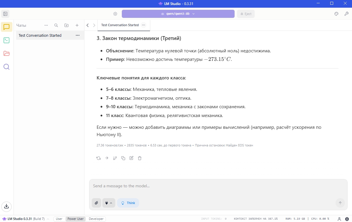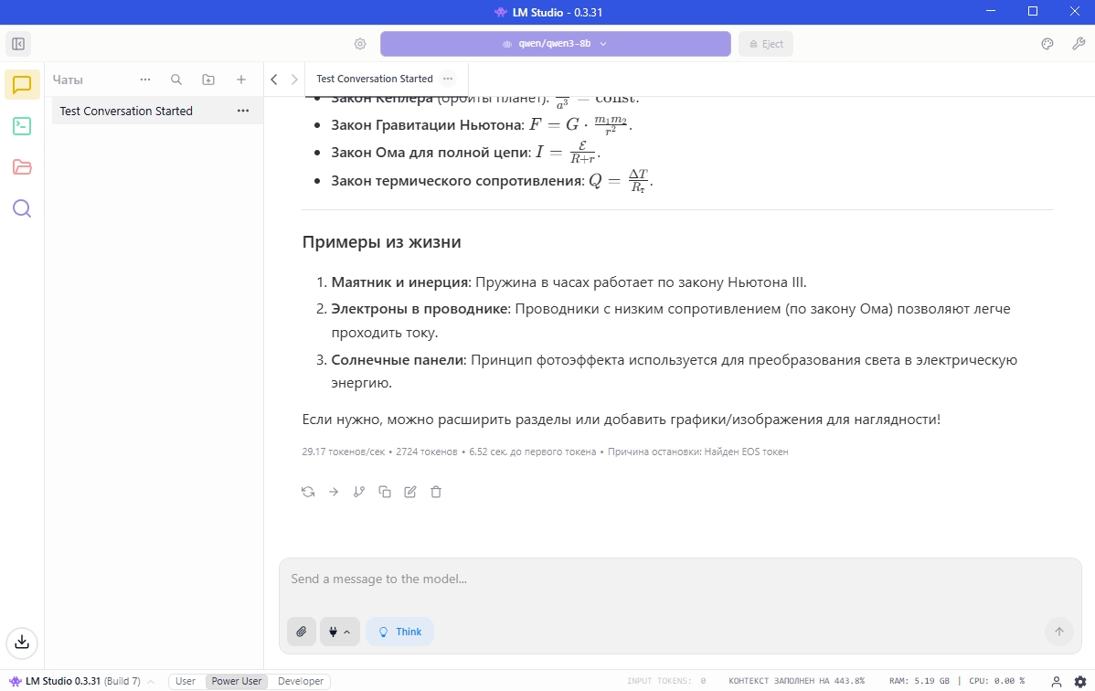 >>7575034 >>7574054 → → >>Грузи LM Studio, загружай в нее модель qwen3-8b с дефолтовыми параметрами, загружай модель в память, создавай новый чат, запрос "Расскажи мне про все физические законы с объяснениями и формулами с 5 по 11 класс" >> >>На 3070M - думает 13.5 секунд, скорость 51 токен/с, 1 с до первого токена (при условии что модель уже загружена). Странные результаты получились. Естественно отсос у обычных карт, 3070 обычная выдает 63 токена в секунду, а цмп50 27-29, хотя с другой стороны 3070 стоит 20-25к, а цмп50 я купил за 4к. Распайка х16 дала +2 токена.