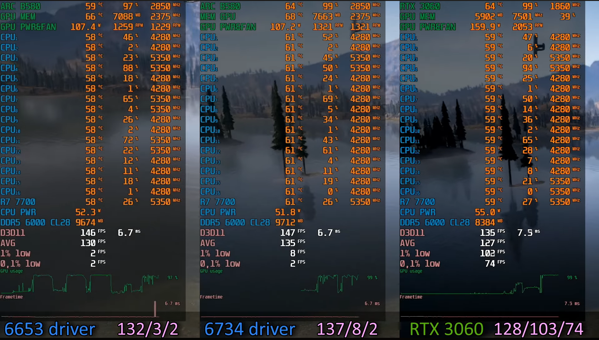 Идем ищем другие видосы с мониторингом и тестовым отрезком в записи: https://www.youtube.com/watch?v=0gvh4eH2blI Тут видос 2месячный, дрова 32.0.101.7029 и 25.9.1, но b580 уже сравнивается с более дорогой 7600хт 16гб. Проц 5900х, тоже не ахти что 6+6 старого зен3, тоже не подсасывает "оверхеду" b580. Просто беру ВСЕ 10 игры, включение fg, апскейла и РТ оставляем на совести автора: В 1 они равны, в 4 7600хт с 16гб выигрывает, в 5 b580 идет впереди. Тут есть нюанс - для хроноса с релизом 5 сентября не выходило ни гейм реди драйвера, ни сейчас в патчноутах он не упоминался, оптимизон для него еще не завозили, для мафии олд кантри в следующих дровах еще были фиксы.