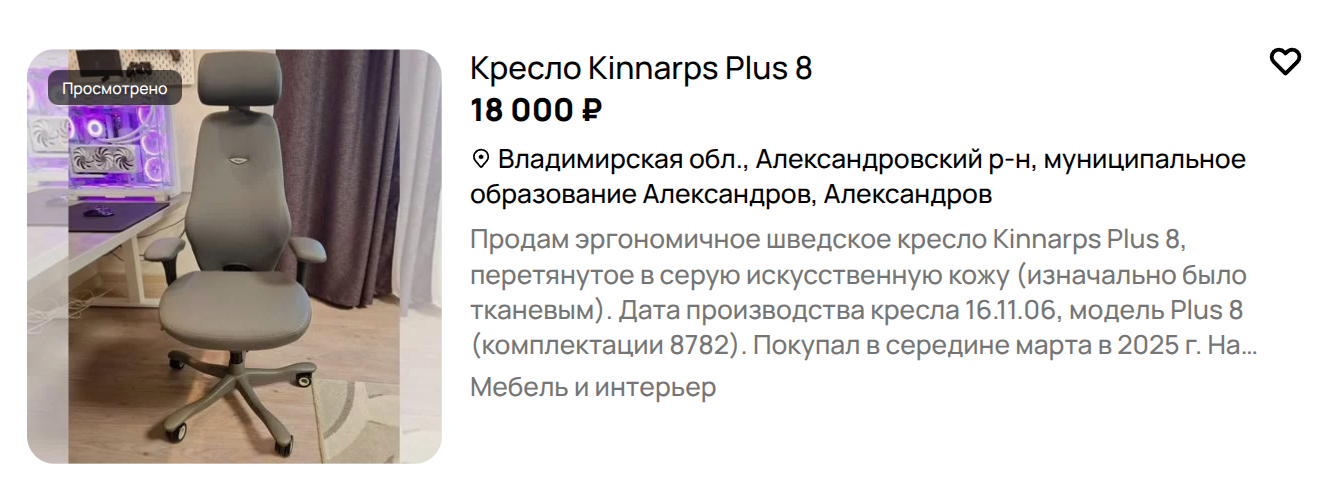 Вчера на Авито выложили Kinnarps красный, топовый, в идеале за 8к (восемь, 8000) рублей. Сегодня уже заброннен кем-то :((((((