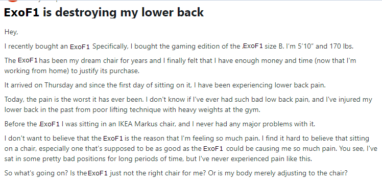 >>7583904 Я в игросралах себя ощущаю как будто в детский стул сел Плечи невозможно расправить, кресло тупо мало и заставляет неудобно скрючиться Поясничная подушка просто дрисня, с ней спина наполовину в воздухе и естественно эта ебейшая нагрузка ещё и под неестественным углом ложится на поясничный отдел. Это прям полный пиздец, просто гарантия получить протрузию и грыжу. Без неё эффект от сжатых плеч ещё сильнее
