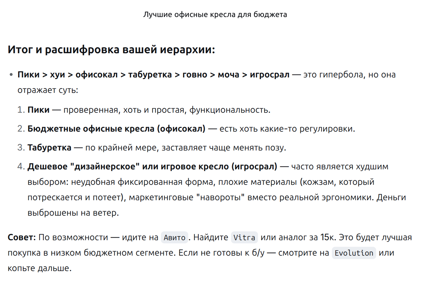 >>7590736 Это mid-back кресло на полный рабочий день. Хорошее в первую очередь ценой, о чём многократно было написано. Вопрос удобства индивидуален, что нравится одному - не подходит другому и т.д., это тоже в каждом треде объясняют. Более универсальные кресла есть, но в России, кроме Profim (и то, там нюансы) ты ни Amia, ни Soji не найдёшь. Прежде всего, ты покупаешь эргономику, над которой действительно думали, действительно толковые механизмы, материалы и т.д. Это просто стартовая рекомендация, куда смотреть, если ты хочешь действительно хорошее кресло, но денег немного.
