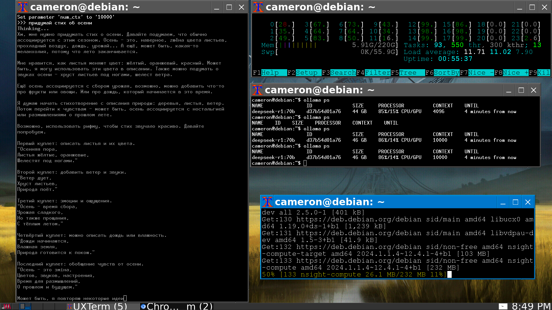 Последнее обновление на сегодня и ливаю. Удалось увеличить контекст до 15к. Это похоже предел в связке видиокарта+зион v2. При больше контексте крашится. Гугл предложил 2 варианта: а) Перейти на винду, где управление памятью как-то отличается или б) обновить железо чтобы был ресайз бар.