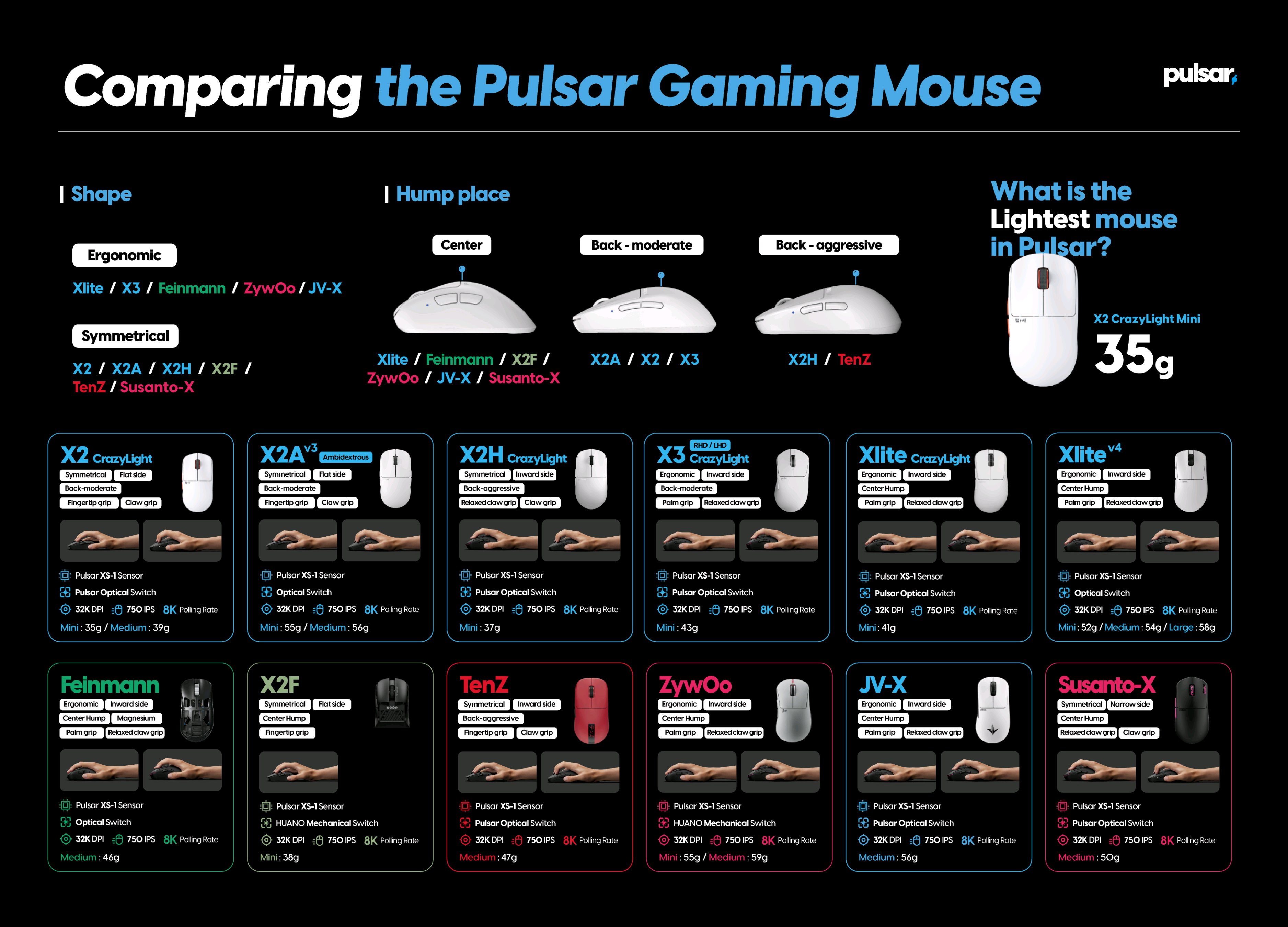 Рекомендаций треб. Вводные: размер и форма Pulsar, вес в районе 50 грамм, беспроводная, батарейка и радио-чип такие, чтобы хватало на пару-тройку сотен часов работы в режиме 500 Гц, условно, чтобы заряжать не чаще, чем раз в пару месяцев. В соревновательные FPS не играю, так что датчику достаточно быть современным и стабильным для работы в 2800-3200 DPI (у меня мониторы с высоким dpi, 4k) Свичи негромкие, оптические либо с хотсвапом, лучше с хотсвапом. Колесо тоже оптическое или с хотсвапом, если такие существуют, ну или хотя бы такой дизайн платы, чтобы разобрать и отпаять энкодер не составляло трудностей. На бренд пофиг, чем дешевле, тем лучше. Мне рабочая лошадь нужна за низкий прайс, а не святой грааль.