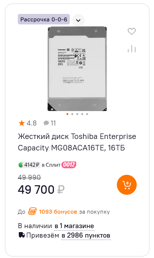 в январе брали на работу 8тб и 16тб сигейты. сначала в днс. 2 8тб не завелись вообще, 2 16тб были с серьезными вмятинами и гремели чем-то внутри. перезаказали другие модели в онлайнтрейде, 2 16тб опять с вмятинами, благо обнаружили при приёмке.