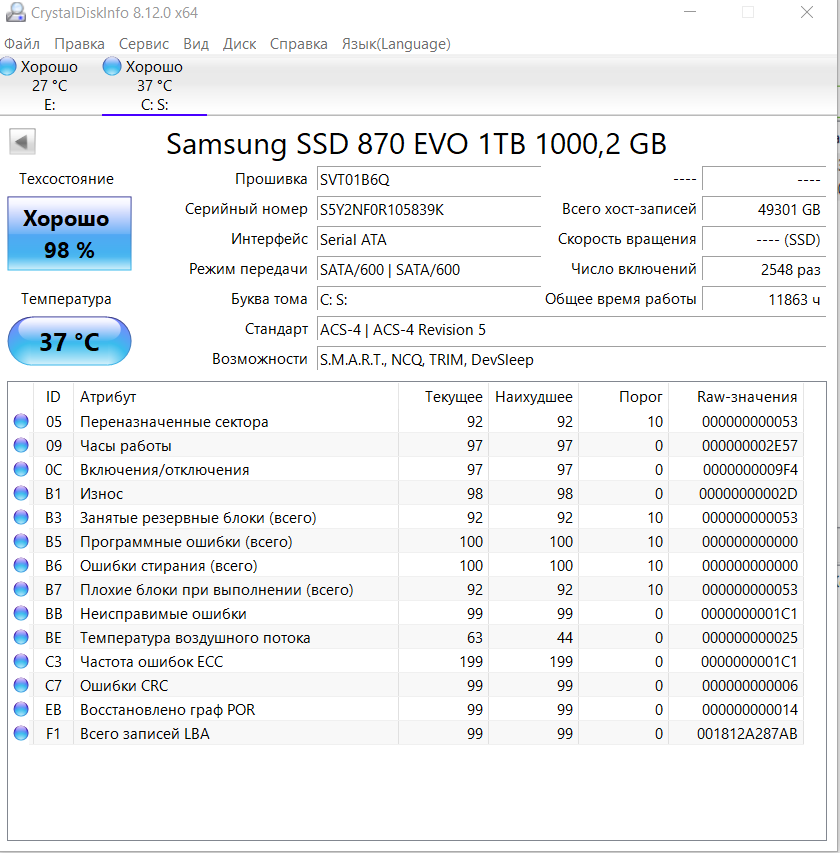 >>7647749 Атрибут C7 чему стал равен после всего этого? И какие у тебя материнка и процессор? Почитай в шапке, самсунги могут капризначить на некоторых чипсетах.