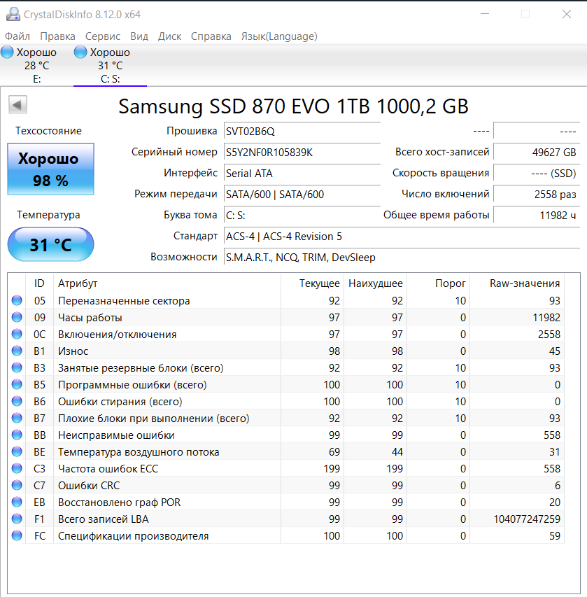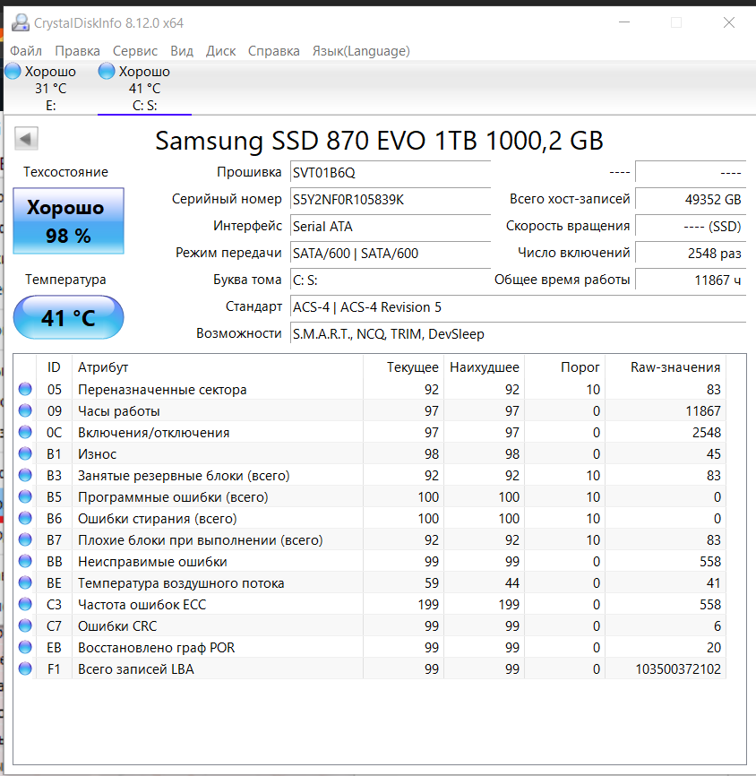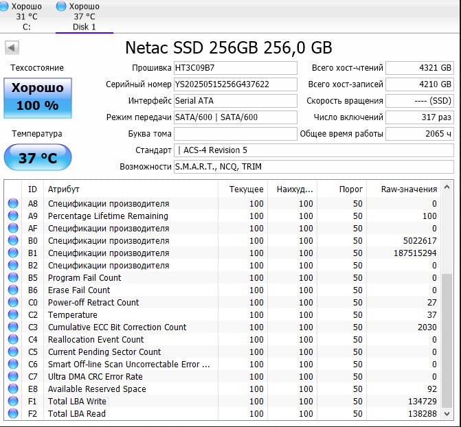 >>7643844 >KC600 и MX500. Да, единственные диски в системе. В разных системах Значит надо проверять SMART информацию все атрибуты программой Crystal Disk Info (в винде) или QDiskInfo (в линуксе).