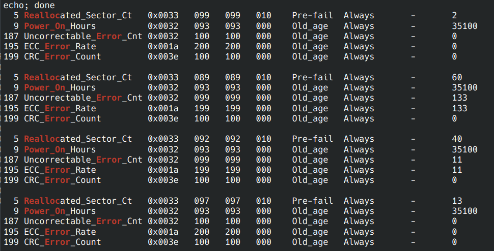 небольшой апдейт со статистикой: из 4 дисков подыхают 3, каждый full read test добавляет от нескольких единиц до нескольких сотен Uncorrectable_Error_Cnt типа было так 187 Uncorrectable_Error_Cnt 0x0032 099 099 000 Old_age Always - 2650 195 ECC_Error_Rate 0x001a 199 199 000 Old_age Always - 2650 199 CRC_Error_Count 0x003e 100 100 000 Old_age Always - 0 а после полного чтения стало 187 Uncorrectable_Error_Cnt 0x0032 099 099 000 Old_age Always - 2714 195 ECC_Error_Rate 0x001a 199 199 000 Old_age Always - 2714 199 CRC_Error_Count 0x003e 100 100 000 Old_age Always - 0