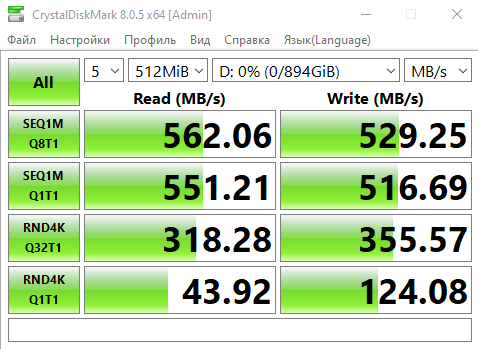 >>7609804 Если ты выйграл силиконовую лотерею и диск попался нормальный то где то 700мб\с. Если ты неудачник и купил худший вариант начинки - то может проседать до 20мб\с.