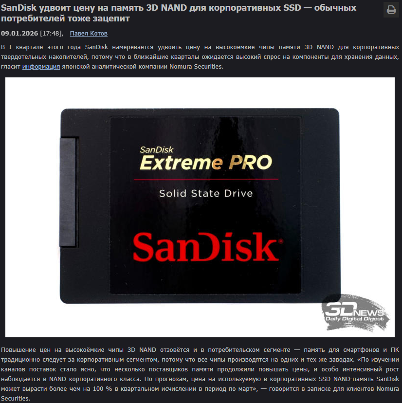 >>7609891 моча потёрла посты, скорее всего за политоту, объясню ещё раз без политоты: из-за "говноИИ" подорожал ровно один товар: чипы DDR5 RAM вследствие удорожания чипов DDR5 поднялись цены и на чипы DDR4 большого объёма, так как в серверах они всё ещё актуальны, а производители чипов понизили или совсем прекратили производство DDR4 для перевода своих мощностей на производство DDR5. рост цен на HDD, SSD, умные телевизоры и вибраторы не имеет никакого отношения к "говноИИ", поскольку в них используются дешёвые нахуй никому не нужные в сфере ИИ чипы объёмом <=1 гигабайт, а то и вообще ссаные 64 мегабайта. по поводу роста цен на эти категории товара все вопросы к кабанчикам производителям этих смартфонов и зубных щёток.