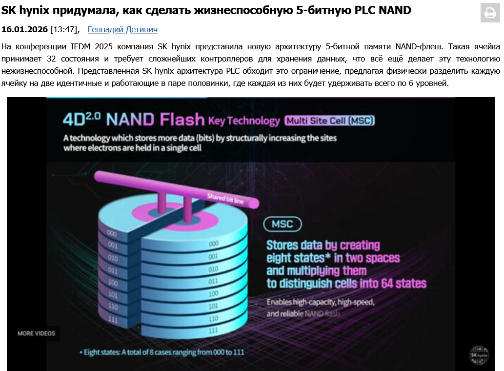 >>7637555 После того, как научились делать 3D ячейки, разработчики флэш памяти уже давно пытаются эту самую ячейку разделить на сегменты (как пирог на дольки нарезать). Вот картинка от 2019 года, где тошиба рекламирует, как она будет резать ячейку пополам и что это якобы увеличит плотность хранения. Видимо достали старое из-под сукна и пытаются на новых материалах попробовать применить. Ну, хоть какое-то движение в сторону повышения плотности хранения информации, а то совсем уж по ценам от HDD отстают на больших объемах.