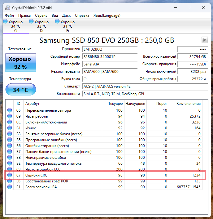 >>7619901 >В чем тогда может быть дело? В кабеле. Атрибут C7 - это количество искажений при передаче данных между пк и накопителем. Для начала замени кабель. Если атрибут C7 перестанет расти, тогда лучше всё стереть, т.к неизвестно что исказилось.