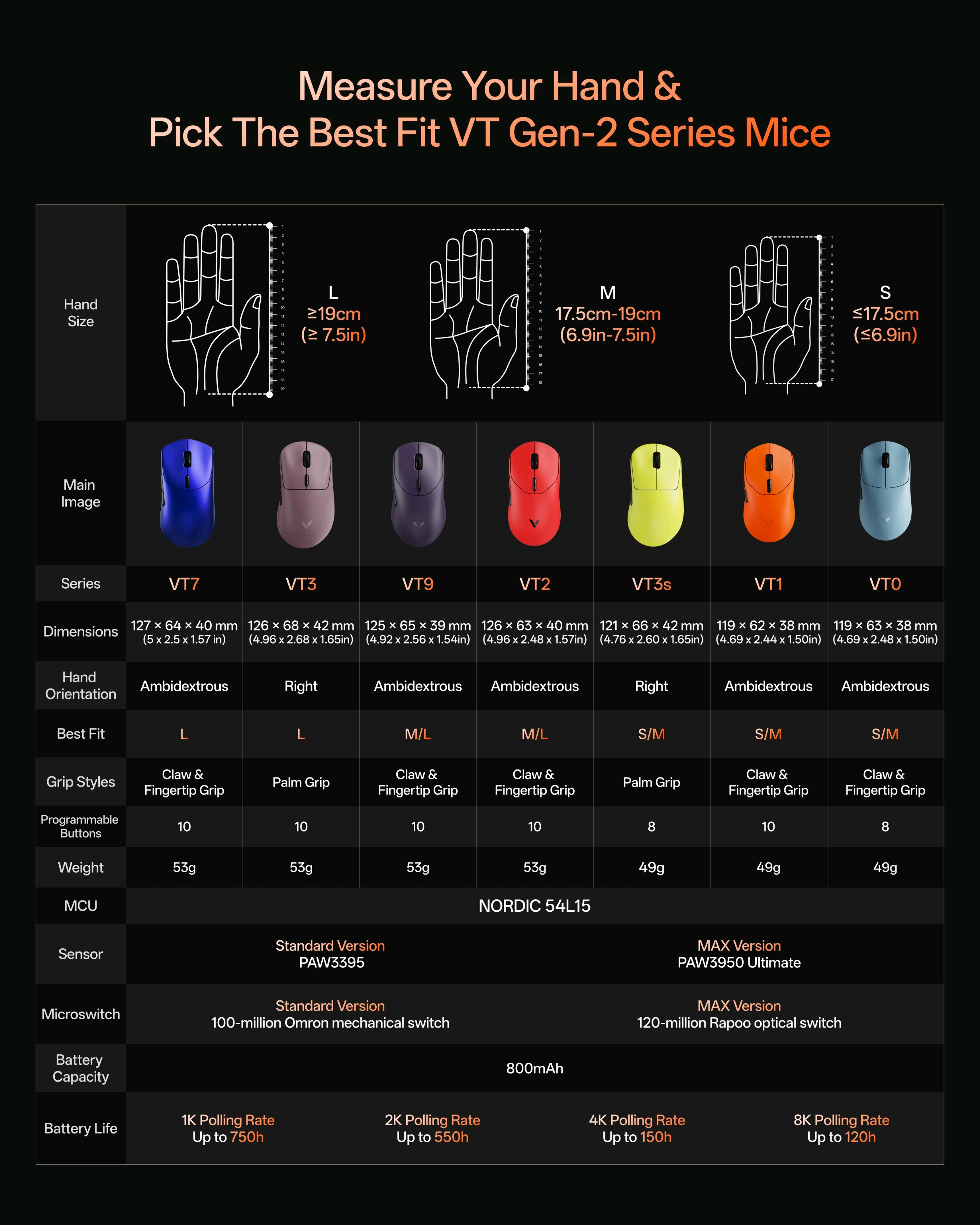 VT 0-9 - 3395 сенсор, механические свитчи, механический энкодер, 800 mah VT 0-9 - MAX 3950 сенсор, оптические свитчи, механический энкодер, 800 mah VT 0 Air MAX - 3950 сенсор, оптические свитчи, оптический энкодер, 300 mah