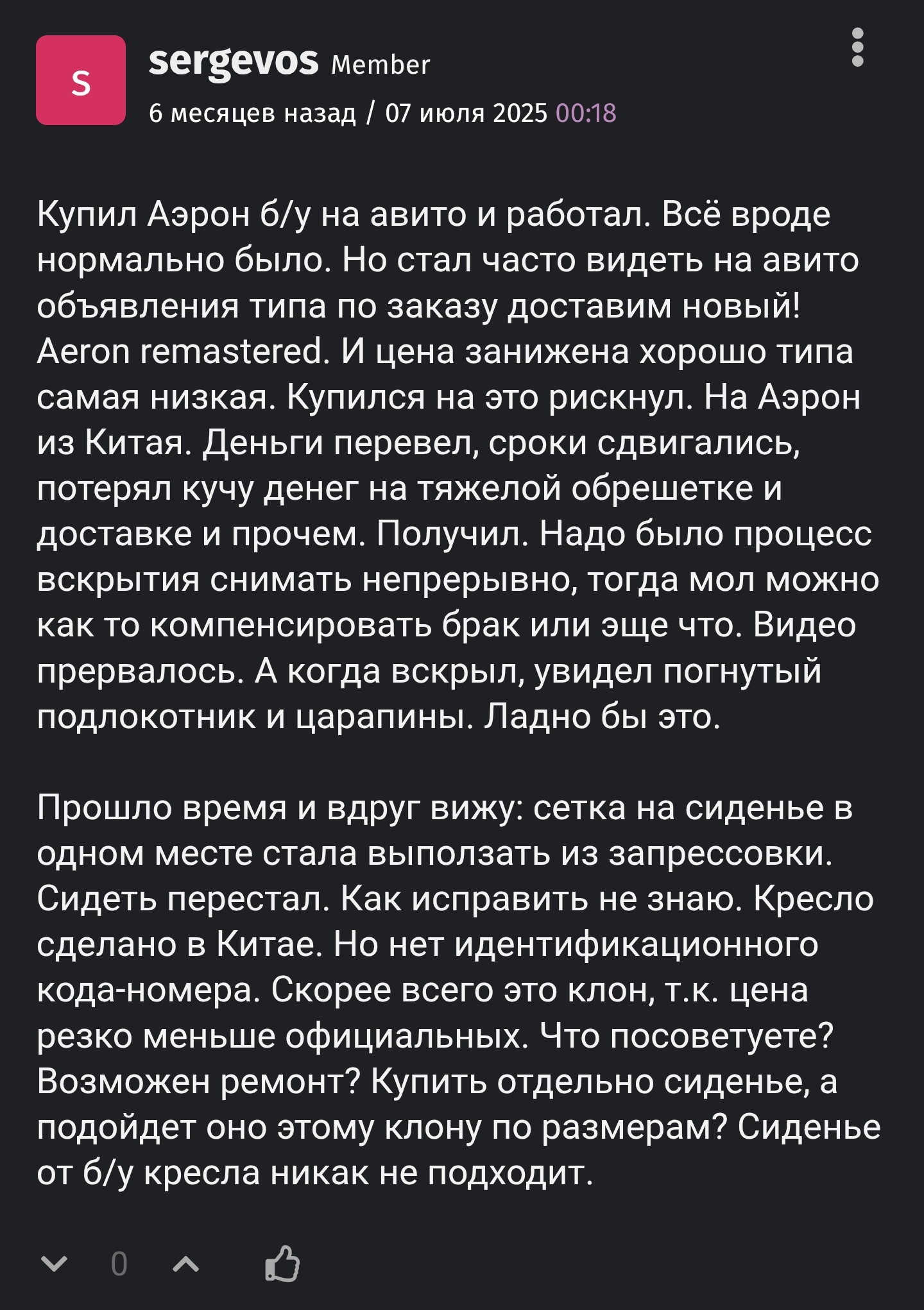 И так заказал себе 5-е кресло. Если и в этот раз не подойдет, то уже точно всё. Из всех на которых я сидел подобное сетчатое понравилось больше всего, но упирался постоянно упор в спину, поэтому взял с плавающим упором, посмотрю как он себя будет вести. С авито проперженные я брать не могу т.к. живу в мухосранске.