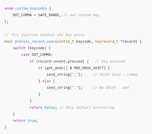 Мне кажется, что Vial уже не соответствует моим требованиям. Могу ли я через QMK сделать так, чтобы конкретная кнопка на конкретном слое всегда выдавала на любой языковой раскладке KC_DOT и KS_COMMA через шифт? Возможно нужен US ANSI юникод обоих клавиш. Через Vial смог только сделать через Key Override, но это чувствительно к английской раскладке. Хочу независимость!!!