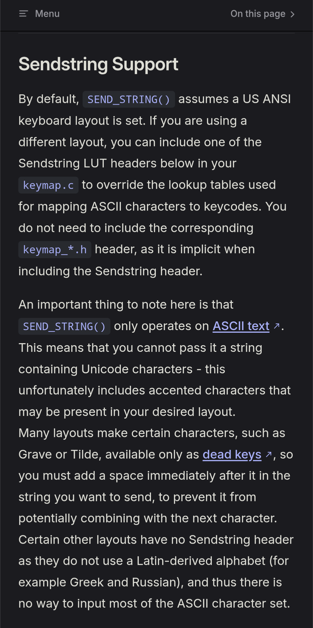 >>7632344 Напрямую нет, потому что клавиатурный ввод проходит программные слои ввода твоей ОС. Их там 4: базовый, поднятый, (редко используемый ctrl слой), AltGr и поднятый AltGR. Как я это сделал: я запилил собственную английскую и русскую языковые раскладки, где AltGR и поднятый AltGr слои — одинаковые. Там у меня пунктуация, типография и т.д. ❄®™³₽‰¥✽„“«»¥∞^¿‰ И вот, если я хочу ввести символ рубля ₽, то это на любой раскладке AltGr+4. А в QMK/VIAL у меня есть слой с цифрами, где мне надо, чтобы посылались точка и запятая вне зависимости от раскладки, так вот, QMK/VIAL обращается к AltGR слою ОС, где у меня они и находятся на любой раскладке.