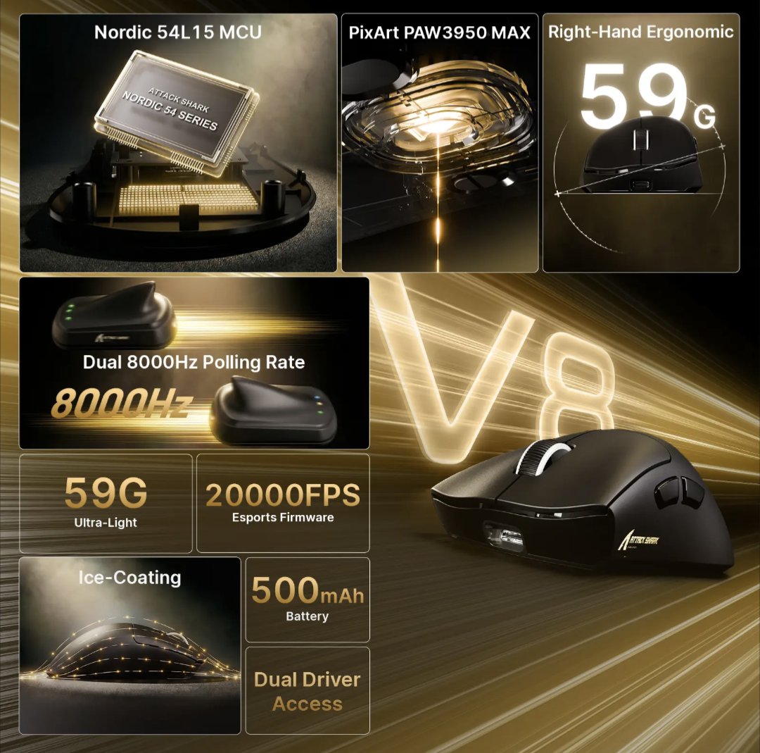 Dark Perk Ergo и Dark Perk Sym. При массе всего 55 г они поддерживают частоту опроса до 8000 Гц, оснащаются сенсором PixArt PAW3950 с разрешением 32 000 dpi и оптическими переключателями Omron