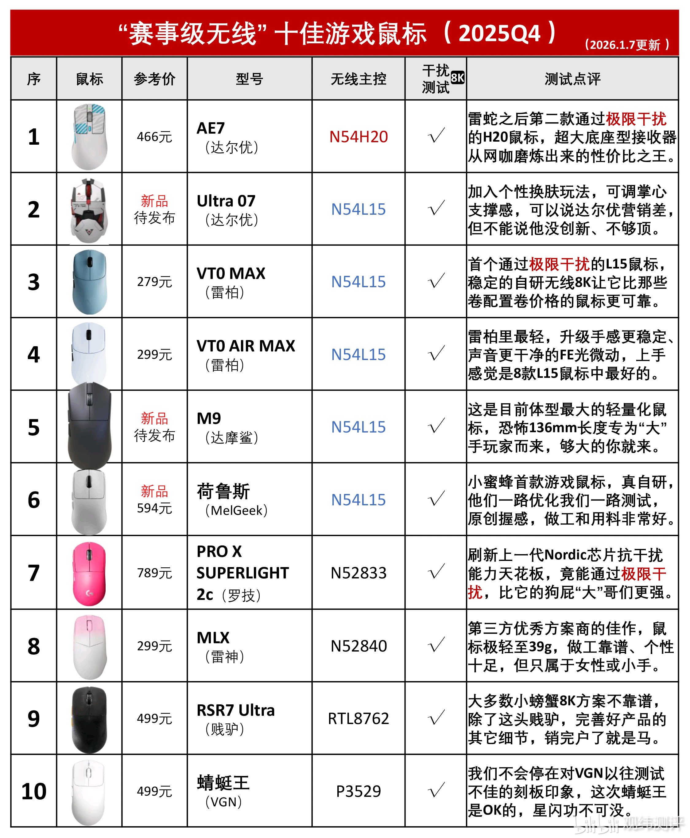 >The ranking is in no particular order. In this list, the proportion of N54 chips, especially the L15, has significantly increased. Apart from the dual 'radar' brothers, the little bee has also joined. In fact, there are some mice that didn't pass the test but also use the N54L15 chip, due to the native 8K and extremely low power consumption of the L15.(40% longer battery life compared to the previous generation)A consensus has formed. Barring surprises, more manufacturers will join in by 2026. Regarding the main control of wireless solutions, last round’s PixArt PAR2862 stood alone, but this round has more options.Realtek, SparkLinkIn terms of solutions, the wireless stability of the Jianlu RSR7 and the Dragonfly King are both very reliable. However, Nordic still holds the highest recognition. We hope to see more domestic chips in the next round.