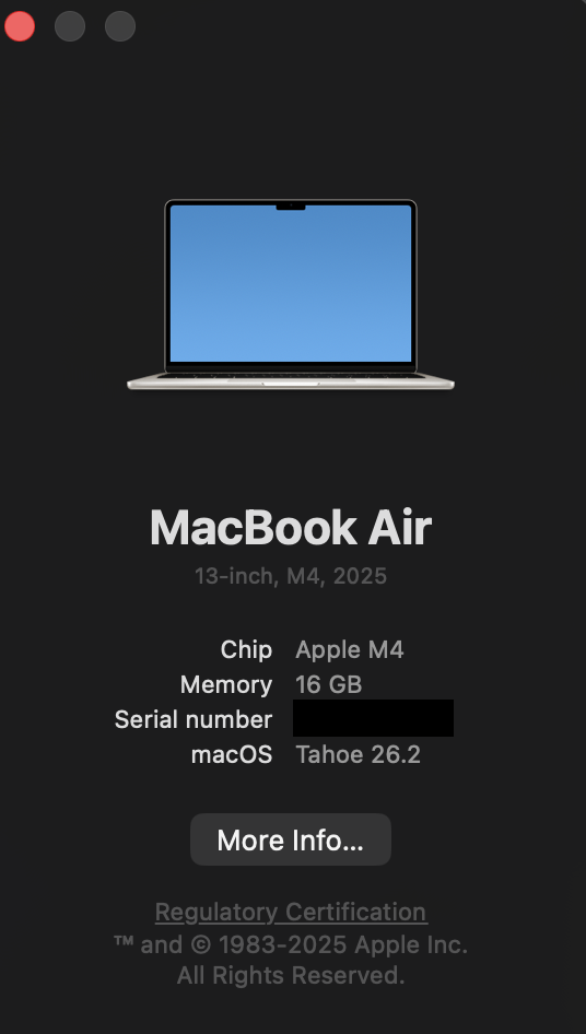 Модель: MacBook Air (начало 2014 г.) ОС: macOS 10.14.6 Mojave Процессор: 1.4 GHz Intel Core i5 Оперативная память: 8 ГБ Графика: Intel HD Graphics 5000 Накопитель: 120 ГБ SSD