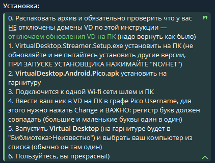 > Pico route (для владельцев видеокарт AMD): 2. Ставь официальную прошивку 5.13.3 с оф сайта, скачай апк файл и с компа закинь в шлем, отключи в шлеме вайфай и ставь прошивку. Потом скачай и накати posr, он не даст шлему принудительно обновляться на последнюю прошивку и позволит пиратить игры. 3.Найди в телеге канал PicoLAND там есть ссылки на все - используй поиск на канале, там же найдешь сотни приложений и игр которые идут под пико, там же и posr апкашкой лежит с инструкцией. 4.Аккаунт пико лучше заводить на смартфоне скачав приложение PICO , найти можно в альтернативном гуглу магазине (бесплатном) Uptodown App Store для Android https://uptodown-android.ru.uptodown.com/android Заведешь акк и только тогда вбивай в шлем .