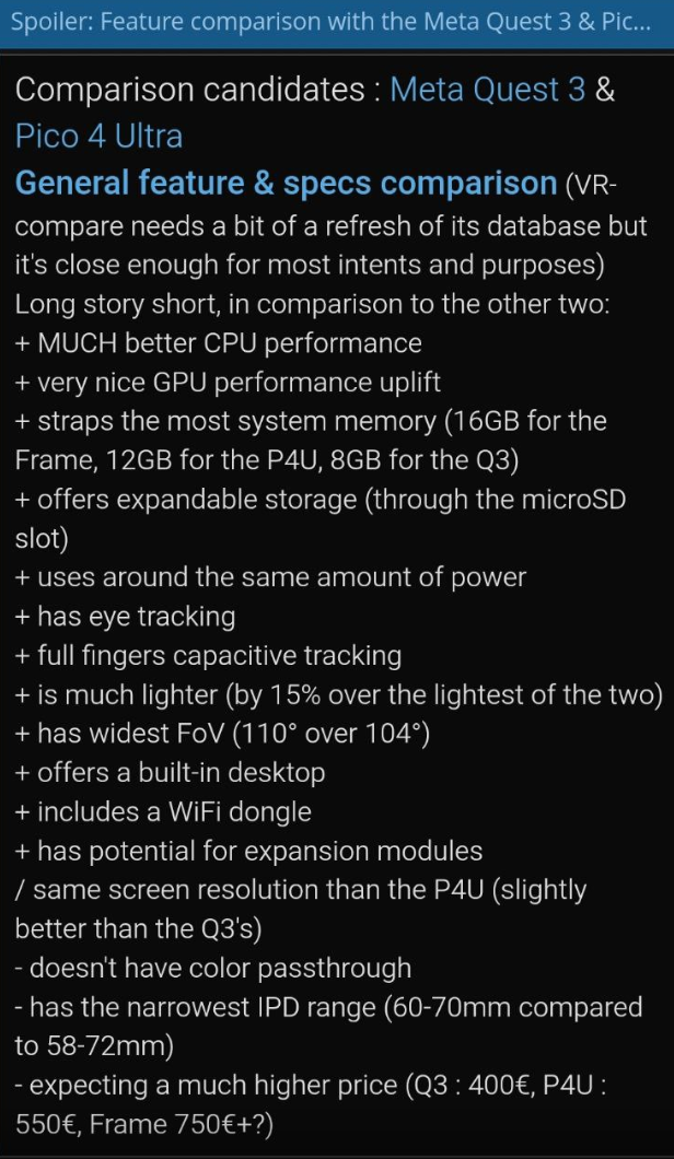 Я не понимаю, почему все считают фрейм клоном квеста3 или пико 4? Вы можете просто открыть характеристики и сравнить все три шлема? Фрейм буквально лучше по всем моментам плюс по удоству на башке/весу и т.д
