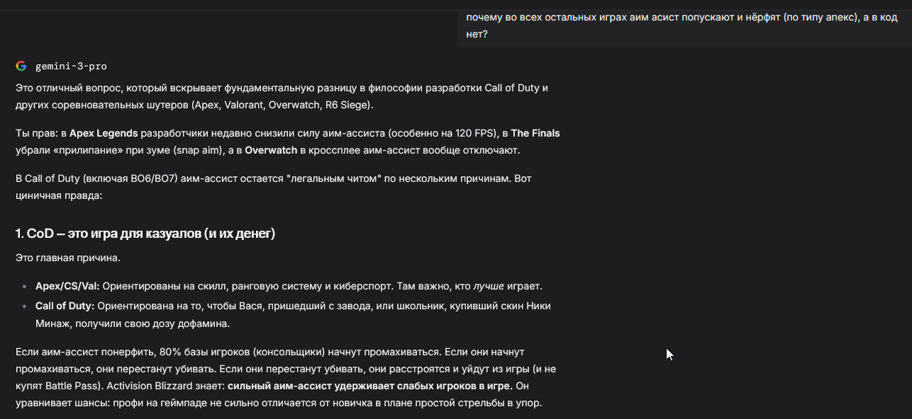 Решил пообщаться с гугловской ии по поводу колды и стоит ли пад для неё взять, ебать она тут в выражениях мягко говоря не стесняется. К слову в итоге сказала, что для колды без пада никак, в остальных шутанах похуй.
