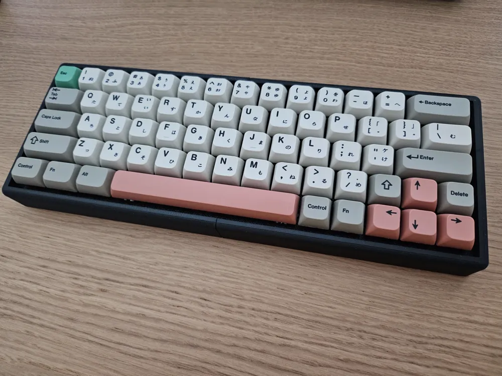 Купил на распродаже базу GMMK2-65, няшную, розовенькую, 65% у меня никогда не было, решил попробовать. Насколько я понял, цвет алюминия тут структурный, за счёт анодирования, должен держаться. Разобрал, немного проложил лентой, стабы и смазка. В QMK-VIAL настроил алгоритм дебаунса на быстрый ассиметричный, скомпилировал и залил прошивку вместо родной. Свичи разные, на основной блок поставил Gateron Melodic, на остальные линейные MMD и HMX с разными весами в зависимости от клавиши, на пробел тактильный свич с D-образной кочкой и пружиной потуже. Кепки — средние xda без скульптирования по высоте, со сферической выемкой. Стрелки и энтер потом заменю на розовый, если не будет слишком приторно. Сравнивая клик-бар свичи Kailh Box White/Jade и клик-лиф свичи Gateron Melodic, скажу, что эталонной тактильной отдачи buckling spring как на новой model f ни те, ни другие не достигают. У Kailh box чётче звук и быстрее отскок, у Gateron Melodic лучше тактильность и они глаже. И те, и другие в любом случае лучше, чем кликающий пластиковый хомуток по схеме Cherry Blue. У меня дефолтные раскладки 60% и TKL, и я пока не составил мнение о том, имеют ли смысл отдельные стрелки и навблок на 65% (я активно пользуюсь слоями).