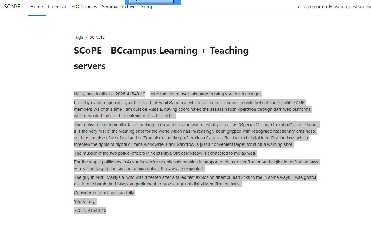 > I hereby claim responsibility of the death of Fanil Sarvarov, which has been commmitted with help of some gullible AUE members. As of this time I am outside Russia, having coordinated the assassination operation through dark web platforms which enabled my reach to extend across the globe. . > The motive of such an attack has nothing to do with Ukraine war, or what you call as "Special Military Operation" at all. Rather, it is the very first of the warning shot for the world which has increasingly been gripped with retrograde reactionary craziness, such as the rise of neo-fascism like Trumpism and the profileration of age verification and digital identification laws which threaten the rights of digital citizens worldwide. Fanil Sarvarov is just a convenient target for such a warning shot.