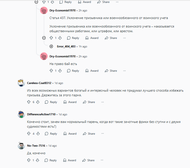 >>136390 Иностранное ВНЖ в РФ не является основанием отсрочки от службы. Самое интерсное, что тебя товарищ майор на паспортном контроле может признать гражданином РФ и отправить служить. Знаю одного челика, гражданина Кубы (мать кубинка, отец - масквич). Свидетельство о рождении кубинское. Прилетел к бате. В Домодедово по приземлении вручили военник и отправили на СВО.