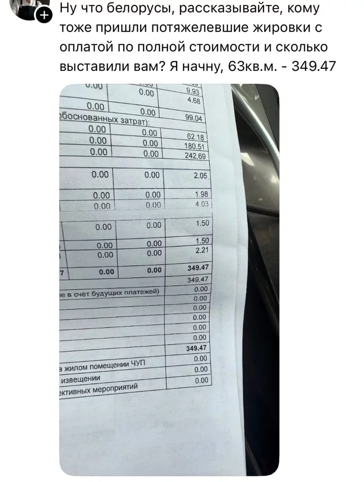 И здесь некоторым пришлось схватиться за головы... Жировки прямо из почтовых ящиков возмущённых лишением халявы тунеядцев полетели прямиком в социальные сети и сервисы микроблогов. Вот женщина, муж которой (и формальный собственник квартиры, где она проживает), работает в Польше, закатывает истерику по поводу коммуналки в 349 рублей за 60 квадратных метров. Вот другой любитель вкалывать на «панов» едва ли не плачет над счётом за коммунальные услуги более чем на 200 рублей за 70-метровую квартиру (и это, надо заметить, ещё скромненько). А рекордсменкой на данный момент оказалась дама, которой за пользование коммунальными услугами пришёл счёт почти в 746 рублей...
