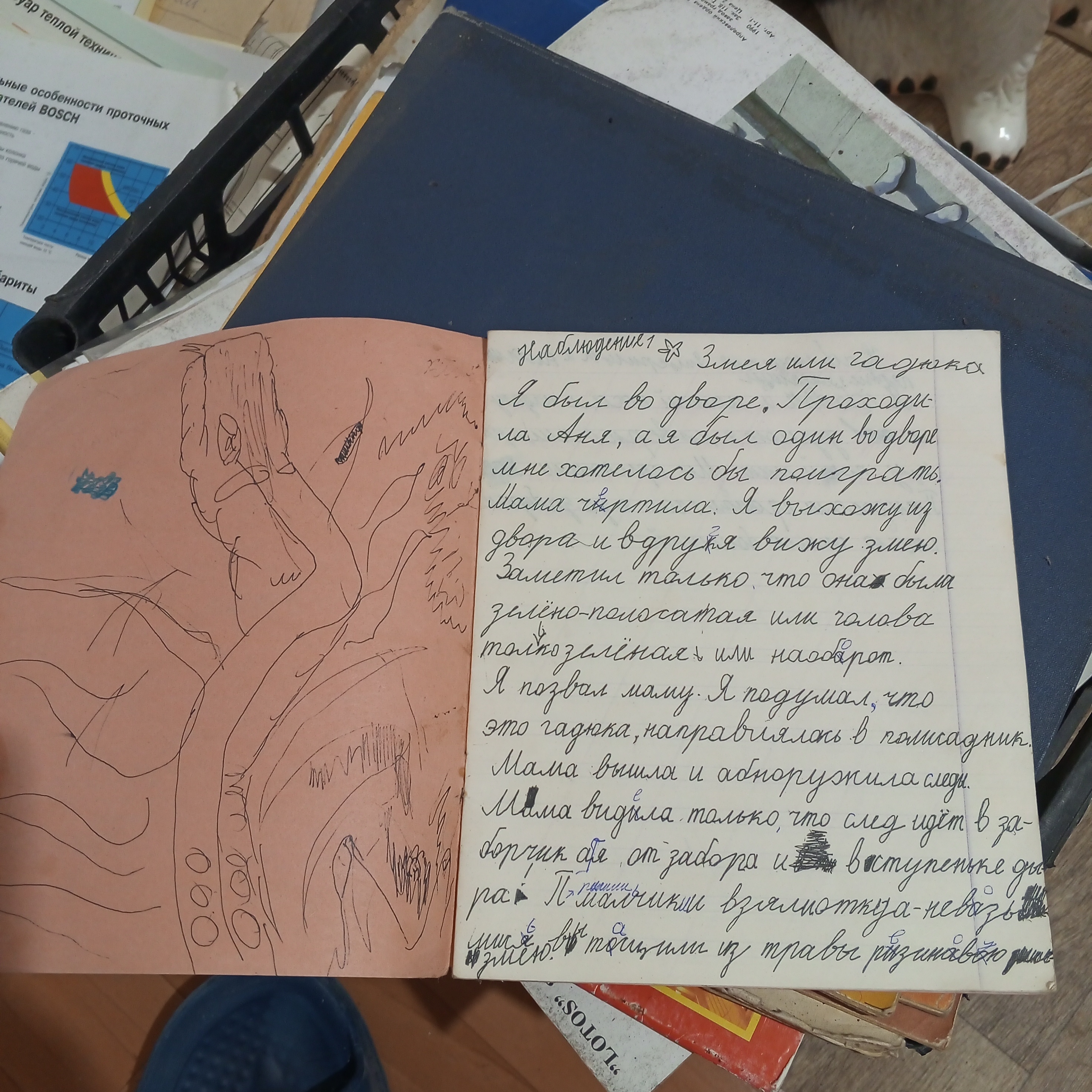 Я уже читал, и в одной из моих новых книжек про змей было про какого-то держателя змей кого укусила очень поганая змея и он понимая что всё равно не выживет решил сделать полезное дело - задокументировать как будет подыхать сколько сможет. Вот я на тот момент писал же уже тоже что-то, восновном пытался выдавить из себя художественные рассказы, пока ещё не понимая что зря тужусь и это будет тоже что и с игрушками, с которыми я так и не понял как играть. А теперь прочитав про этого змеевода я впервые в жизни вдохновился на дневниководство. Но я хотел также как он - описывать не себя, а рептилий, быть натуралистом, что, ввиду отсутствия как предметов изучекния так и особого интереса к ним, у меня не сложится, поэтому дальше пары страниц тетрадок с описанием единичных случаев столкновения с рептилиями у меня никогда не пойдёт. У меня есть тетрадка того года. Вот первая страница там: ---- "Змея или гадюка" Я был во дворе. Проходила Аня, а я был один во дворе мне хотелось бы поиграть. Мама чартила. Я выхожу из двора и вдрук я вижу змею. Заметил только что она была зелёно-полосатая или голова толко зелёная или наобарот. Я позвал маму. Я подумал что это гадюка, направлялась в палисадник. Мама вышла и абнаружила следы. Мама видила только что след идёт в зборчик а я от забор и в ступеньке дыра! Пришли мальчики взяли откуда-невозьмися вытащили из травы ризинавою змею. ----- На двух других страницах там по чуть чуть про эпизоды из лета до которого пока ещё не дошли. в общем, тогда Своё сознание как объект исследования меня совсем ещё не интересовало. Ещё не понимал что, как тот укушенный иследователь, я тоже уже умираю. Потому свой такой дневник начал вести только в двадцать лет. Сейчас в нём уже четыре миллиона слов.