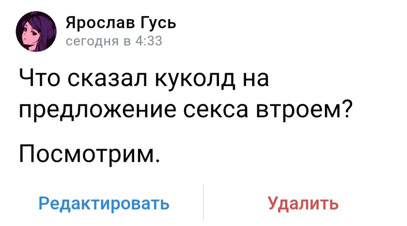 >>448074 >Мамлеев, Пелевин, Михаил Лазарев ("Курочка, открой дверь!") и Сорокин. Некислая такая подборочка, очень интересные авторы, без шуток, но, как по мне, для начинающего воспроизведение их стиля - задача со звёздочкой! И если Пелевина ещё не так сложно "повторить" - просто иронизируешь до посинения и вроде всё срастается, то Сорокин и Мамлеев требуют прям особого состояния сознания, дабы что-то похожее на них получилось. Тебе бы попрактиковаться на материале попроще, на самом деле, Иванова там почитать ("Географ глобус пропил", "Пищеблок"), Нестеренко (вот у него совершенно имбовые хорроры типа "Отчаяния") и иже с ними... >Спасибо что маякнул! Обязательно загляну и почитаю на днях :3 Спасибо и тебе, буду ждать! >Можешь уточнить, пожалуйста? Я про сцену, где, незадолго до "пробуждения", ГГ и Ангелина находятся у неё в квартире и девочка сначала садится перед прижавшимся к тумбочке ГГ на корточки зачем-то, а потом, пару абзацев спустя, гладит его, лежащего, по волосам, и говорит про то, что они занимаются чем-то ужасно неправильным. Может, я уже додвачевался до такой степени, но мне кажется, что в этой сцене, пока повествование занято мыслями героя о чём-то отвлеченном, между ним и Ангелиной могло кой-чего произойти, плюс, когда ГГ выходит из квартиры, Захар же Ангелину блядью за что-то называет... Местные реально могли принять это за завуалированную сцену соития.
