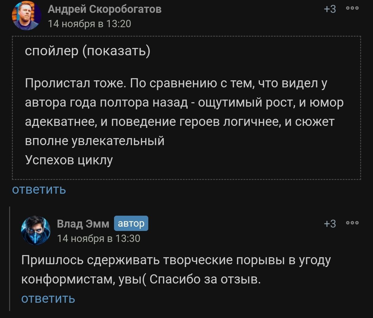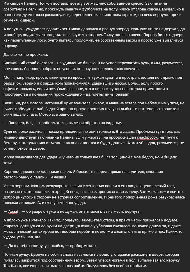 У него хотя бы есть двухтомники, а у меня, если я прочитаю свой текст, закрадывается мысль, бляя какое же говно я пишу, и после 3-4 глав перескакиваю на новую историю.