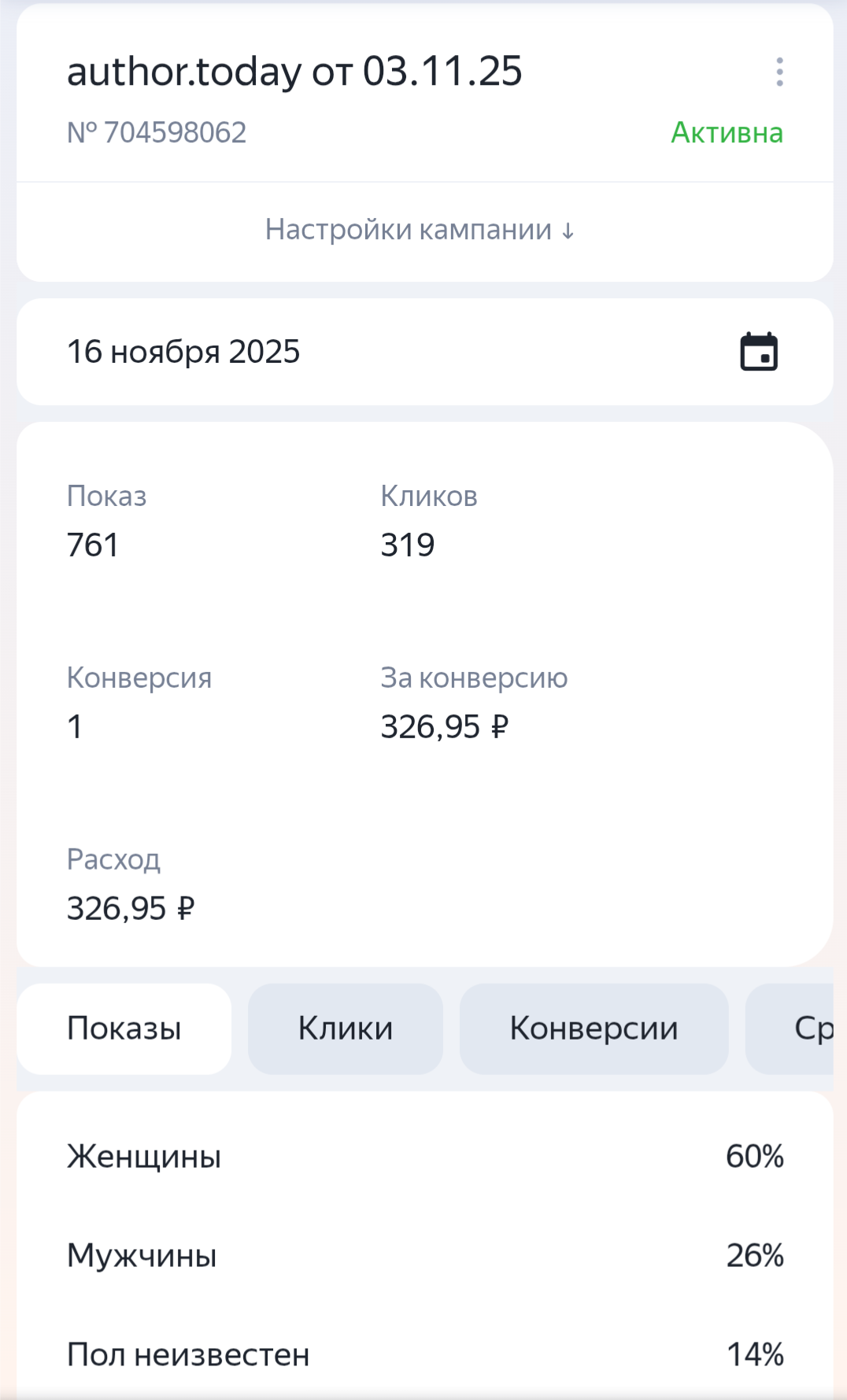 Так вот, соавторки в этом плане почти всегда мертвые. Потому что у тебя роялти не 85%, а 47,5%, плюс реклама блокирует кабинет того, на ком висит первый том (привет архитектуре АТ, ты можешь рекламить только один свой цикл, потому что директ считает любые кампании на твой алиас дублями вне зависимости от того, одна эта книга или разные).