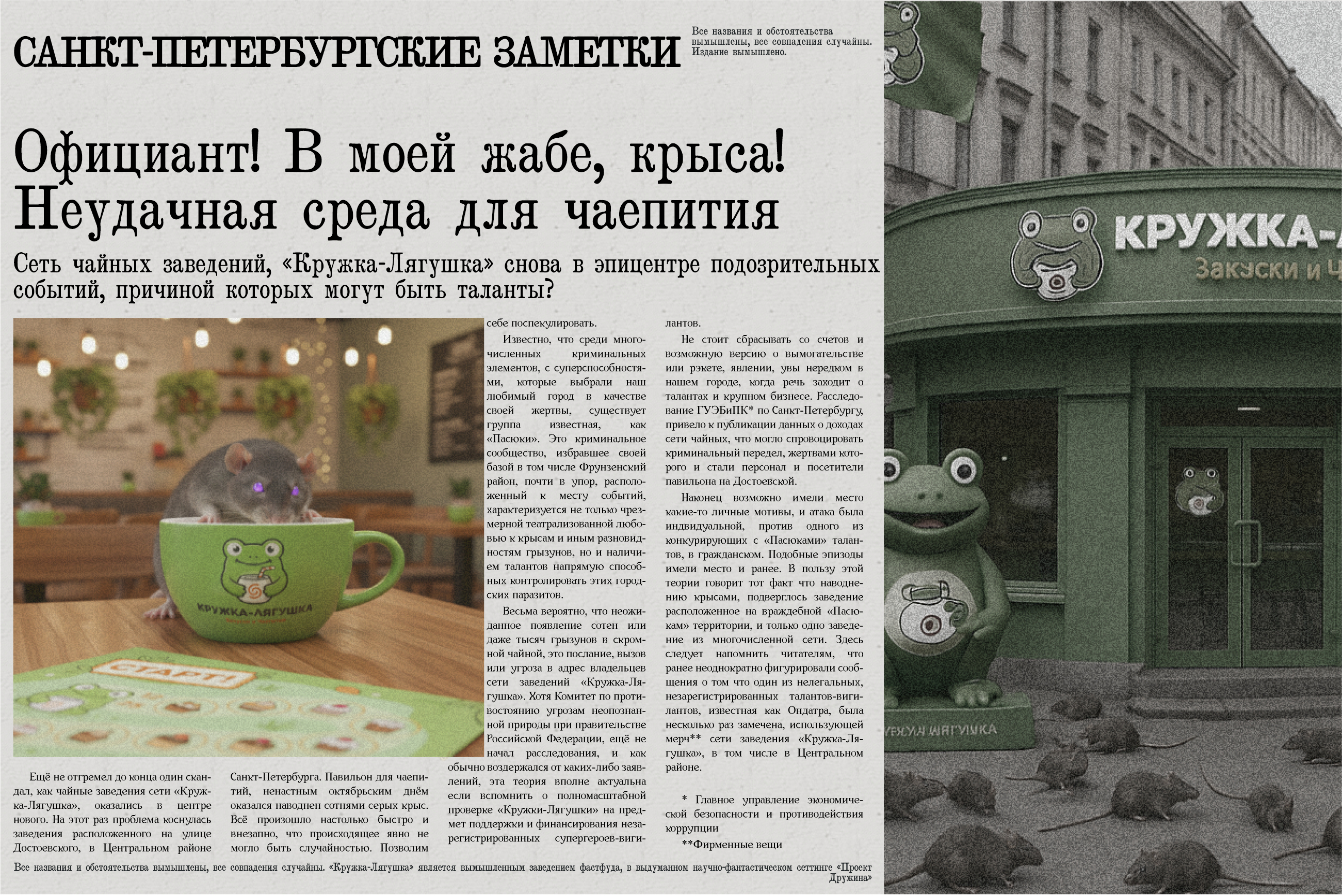 Ещё не отгремел до конца один скандал, как чайные заведения сети «Кружка-Лягушка», оказались в центре нового. На этот раз проблема коснулась заведения расположенного на улице Достоевского, в Центральном районе Санкт-Петербурга. Павильон для чаепитий, ненастным октябрьским днём оказался наводнен сотнями серых крыс. Всё произошло настолько быстро и внезапно, что происходящее явно не могло быть случайностью. Позволим себе поспекулировать. Известно, что среди многочисленных криминальных элементов, с суперспособностями, которые выбрали наш любимый город в качестве своей жертвы, существует группа известная, как «Пасюки». Это криминальное сообщество, избравшее своей базой в том числе Фрунзенский район, почти в упор, расположенный к месту событий, характеризуется не только чрезмерной театрализованной любовью к крысам и иным разновидностям грызунов, но и наличием талантов напрямую способных контролировать этих городских паразитов. Весьма вероятно, что неожиданное появление сотен или даже тысяч грызунов в скромной чайной, это послание, вызов или угроза в адрес владельцев сети заведений «Кружка-Лягушка». Хотя Комитет по противостоянию угрозам неопознанной природы при правительстве Российской Федерации, ещё не начал расследования, и как обычно воздержался от каких-либо заявлений, эта теория вполне актуальна если вспомнить о полномасштабной проверке «Кружки-Лягушки» на предмет поддержки и финансирования незарегистрированных супергероев-вигилантов. Не стоит сбрасывать со счетов и возможную версию о вымогательстве или рэкете, явлении, увы нередком в нашем городе, когда речь заходит о талантах и крупном бизнесе. Расследование ГУЭБиПК по Санкт-Петербургу, привело к публикации данных о доходах сети чайных, что могло спровоцировать криминальный передел, жертвами которого и стали персонал и посетители павильона на Достоевской. Наконец возможно имели место какие-то личные мотивы, и атака была индвидуальной, против одного из конкурирующих с «Пасюками» талантов, в гражданском. Подобные эпизоды имели место и ранее. В пользу этой теории говорит тот факт, что наводнению крысами, подверглось заведение, расположенное на враждебной «Пасюкам» территории, и только одно заведение из многочисленной сети. Здесь следует напомнить читателям, что ранее неоднократно фигурировали сообщения о том, что один из нелегальных, незарегистрированных талантов-вигилантов, известная как Ондатра, была несколько раз замечена, использующей мерч сети заведения «Кружка-Лягушка», в том числе в Центральном районе. Так или иначе, один факт из множества теорий, не подлежит сомнению. К утренним событиям в павильоне на Достоевской, определённо приложили руку владельцы суперспособностей, и намерения их были далеки от благожелательных Главное управление экономической безопасности и противодействия коррупции Фирменные вещи