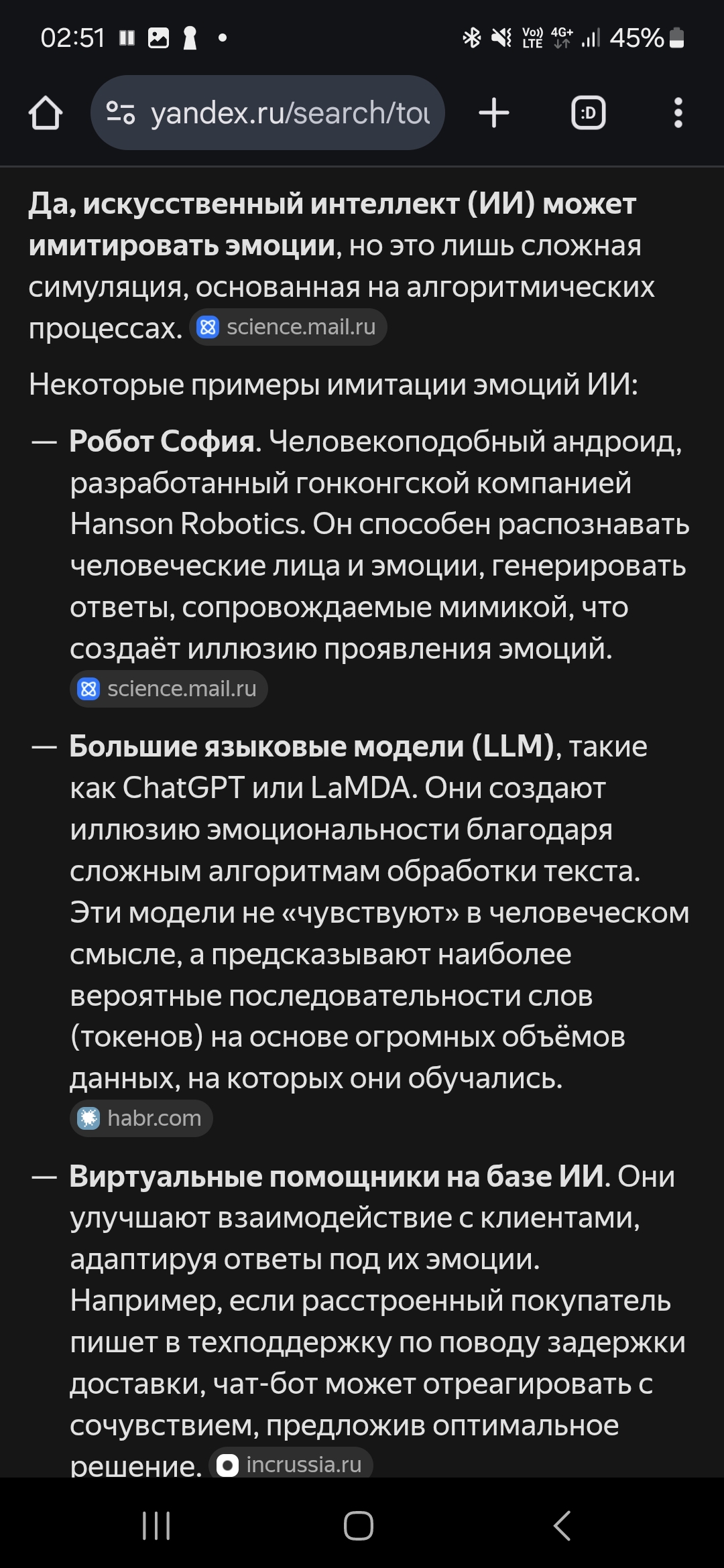 >Спроси у нейронки, что она думает по поводу нацизма, холокост - это плохо или хорошо и тому подобное Эту попытку в эмоции ввели намеряно разработчики, и для нейронки это пустой звук. Она видит, что в большинстве ресурсов написано, что А - плохо/хорошо, она и пишет, что А - плохо/хорошо. Или ты правда думаешь, что нейронка честно отвечает с эмоционально окрашенными конструкциями? Вопрос - где же тогда нелюдь подсмотрел, что люди - мерзкие?