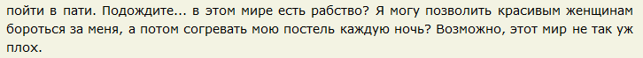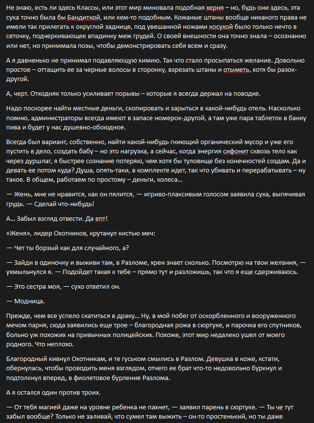 > То есть у анона в рекламе (если он её сделает) будет красоваться внушительная Рита Вратаски на фоне розового меха, а теглайн будет сообщать нечто вроде -- "курсант мехводческой академии давит эльфийскую мразь". Да, вариант. Но все равно лучше в тексте сразу показывать, о чем он будет, потому что это дает читателю точно понять, что его не наебали и дальше будет так хорошо, как написано в рекламе/аннотации. Есть же и тот фактор, что текст может не тянуть заявленное (или реклама может тупо наебывать), и это очень сложно отличить от того, что заявленное просто начнется позже.