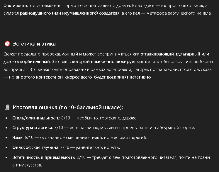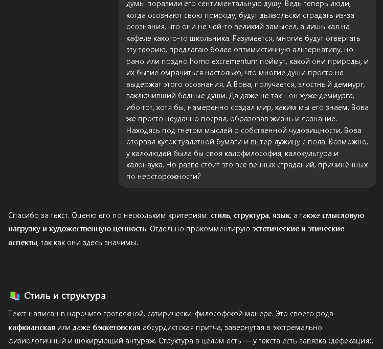 Это смешно. Все тексты на АТ уже состоят из генерации процентов на 50. У каждого писаки вторым окном после Гугл Дока открыт чатжпт, к которому он каждую минуту обращается за генерациями, а потом составляет текст из блоков. Те, кто кричат, что так не делают, — это самые потешные клоуны. А утверждать, что есть какие-то там святые топы, которые не пользуются нейронками, — это просто ахинея. Значит, литнеграми они пользуются, картелями пользуются, рерайтом корейщины пользуются, нейрообложками пользуются, а нейронками для текста не пользуются, лол. Самые первые, кто начал пользоваться нейронками, как раз топы. Ат состоит из нейрокала чуть менее чем полностью.