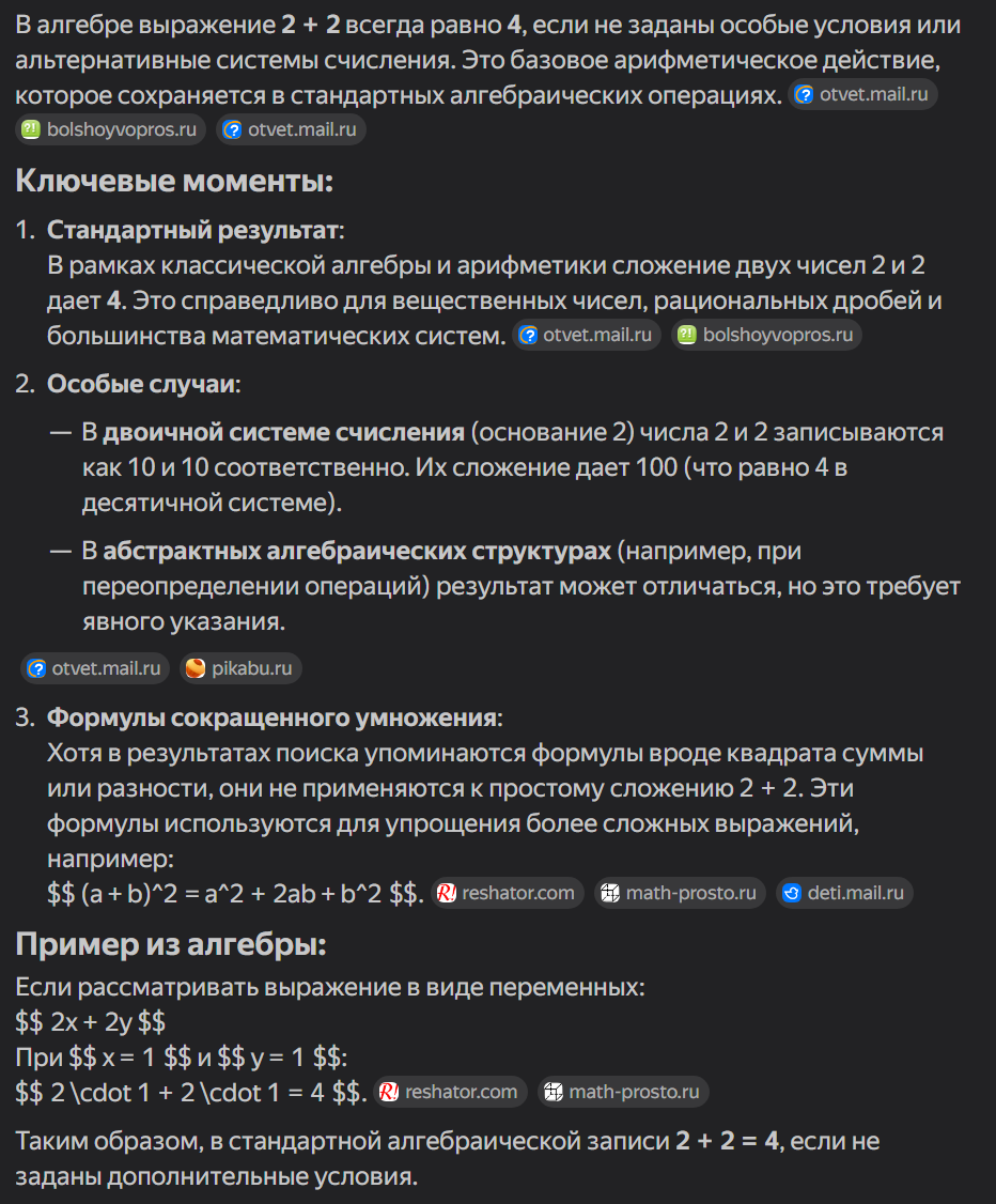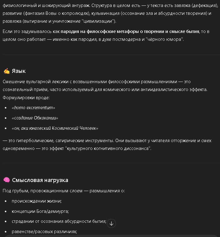 >>445233 >Да нахуй они никому не нужны. Синонимы хуево выдает, ошибки не ищет, логические связи теряет, постоянно повторяется или наоборот, хуярит в соседних абзацах абсолютно взаимоисключающие по смыслу вещи. Говно. Если хочешь, чтобы за тебя весь текст был написан, то да, именно так. Если же по мелочам, когда нужны варианты развития сюжета, например, то тут нейронка может хорошо помочь. Да, она не сама выдумывает, а миксует, но очень полезные варианты может выдать.