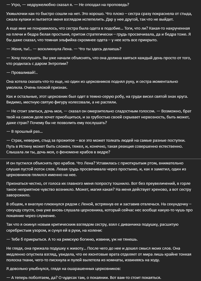 >>445226 >>445227 Вам за примером далеко ходить не нужно, можете прямо итт спросить кто писал нейротекст и какой результат это дало. Или написать самому, если это так легко. >Читатель, кто потребляет такое хрючево, внезапно сообразит, что если качество одинаковое Не одинаковое. Читателю интересно или не интересно. Если не интересно то ты его не удержишь, не продашь ему платную часть книги и он не перейдет на следующий том.