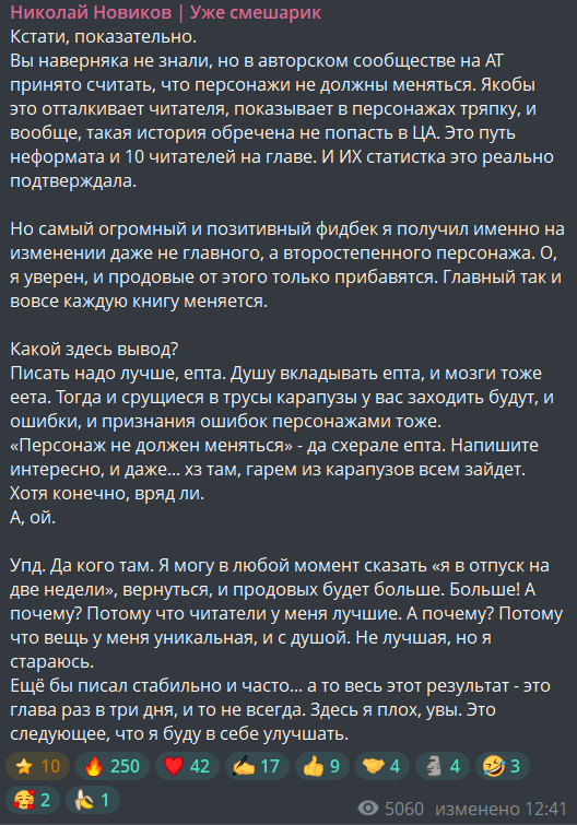 Это в гайды надо, в шапку треда. Сначала ты просто набиваешь руку, учишься кайфовать от творчества и писать хорошо (первые Анины сборники рассказов), потом делаешь свой первый провальный, но искренний неформат (Анины боевые девицы), потом, имея живой опыт с живыми читателями, пытаешься вкатиться уже в формат ("Жека"), а потом находишь идеальный баланс между творчеством и форматом и идешь В ДАМКИ (циклы про фигуристок).