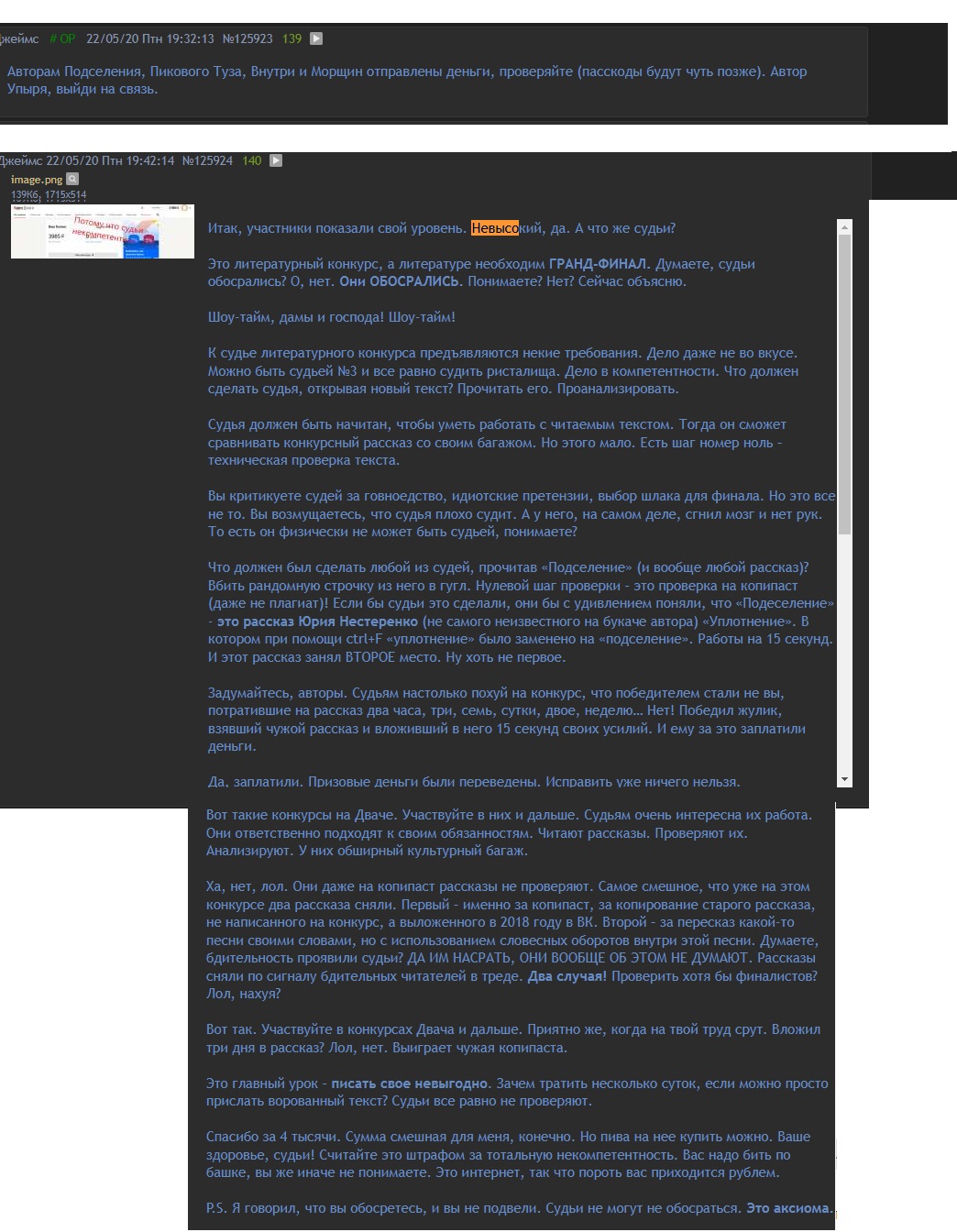 >>450300 Судьи такие же Джеймсы, как и вы, сэр. Просто взявшие на себя дополнительные обязательства по организации данного мероприятия. Подозревать их в том, что они собираются попилить деньги призового фонда, которые они сами же в него вложили — лишённое здравого смысла оскорбление. Это же как в том анекдоте про "украсть ящик водки, продать, деньги пропить". Вы уж совсем нас за идиотов не принимайте. Основное преимущество двачеконкурса перед остальными подобными — анонимность (пусть и условная) и обязательная обратная связь от участников. Интерес же в том, чтобы прочитать мнение о своём рассказе без привязки к личности автора. А не в том, чтобы вывалить нейрослоп и хихикать в кулачок, мол, вон как я Джеймсов обманул! Хотя не сомневаюсь, что подобные персонажи появятся. В конце-концов, это же двач.