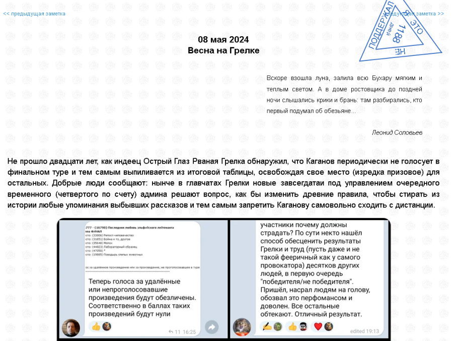 Теоретически что может помешать нейроанону прислать сотню другую рассказов нагенерированного и отредактированного слопа (работы на половину рабочего дня) и закончить принятие работ досрочно, а то и выиграть что-то просто по статистике?