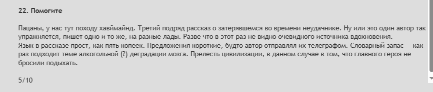 >>451850 >>450224 (OP) >ВкусНяшки Паста про говно, которую завернули в капустный лист слайс-оф-лайфа. Получились мета-голубцы с говном. Спасибо, Семён Семёныч, я не голодный. 1/10 >Последний полёт Саши Паста про куколдов, рассказанная через хининовый трип. 0/10. Ничего личного, Джеймс, за пасту про куколдов я бы хоть Толстоевскому, хоть Джозефу Конраду 0/10 влепил. >Вечный Столько слов, столько стараний, а тема лесбиянок так и не раскрыта. Updated my journal: 0/10 >Отражение Зашли как-то Лем, Платонов и Тарковский в издач, сели в лужу и там погрязли. Рассказ не нравится. Вроде бы всё на месте, но не нравится. Есть какая-то нескладность и незавершённость. И зачем ты рассказ на главы делил, как начпис или нейронка? Пусть будет 5/10, выше поставить не могу. >Юра, прости, мы все проебали Паста про куколдизм. В принципе, я другого от коммуниста и не ожидал, но ты мог хотя бы попытаться не писать про куколдизм. 0/10, бери пример с автор_ки, которая прислала >Поиск - эта автор_ка попыталась не писать яой, и у неё даже получилось! Честные 5/10 за старания. >Вудсток Не моё. Роуд-муви на семь страниц, и я не понимаю, кто все эти люди и хули им на жопе не сидится. Важное достоинство: коротко. Потому 6/10. >Очередное счастье Когда на конкурс прислали третью пасту про куколдов, мне надоело на них смотреть и я пошёл на оптоовощной рынок, где, говорят, откопали курган хазарского кагана. 0/10 >Последний полет мулатки Джеймсятина постклассическая. Здесь Джеймс - не нытик с сигаретой, а мастер кунгфу, и сеттинг - не окрестности Ионотеки, а вилаят Котельники. Слегка сумбурно, очень начписово, есть тяночка-яндерочка и хеппиэнд, в целом хорошо. 7/10 >Начало безумия Андрея Степановича Дорогой Мартин Алексеевич! Я, конечно, оценил ваш мета-способ плюнуть в рожу организаторам - переписать страничку из учебника психиатрии и прилепить тему пятой ногой. Но рассказом это назвать нельзя. С уважением, автор "Шитпоста". 0/10
