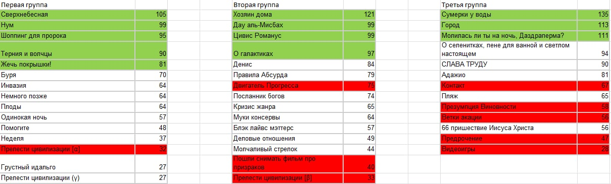 Блин, ОП, ты бы хоть приписывал красным текстом к отсеянным рассказам, за что (т.е. рассказ кончился, перенос строки и красным текстом причину "за что"). Интересно же.