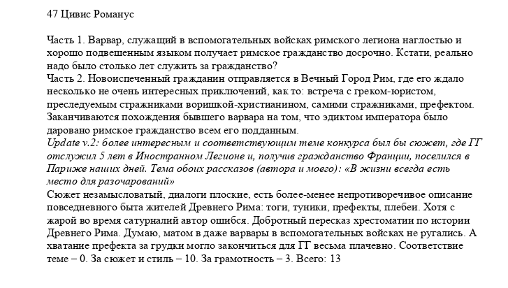 Было бы хорошо, чтобы судьи заранее сказали про свои рассказы. Для уравнивания шансов, так сказать. Участвовал в 3-х конкурсах. И везде, кроме 1-го судейские опусы занимали первые 3 места