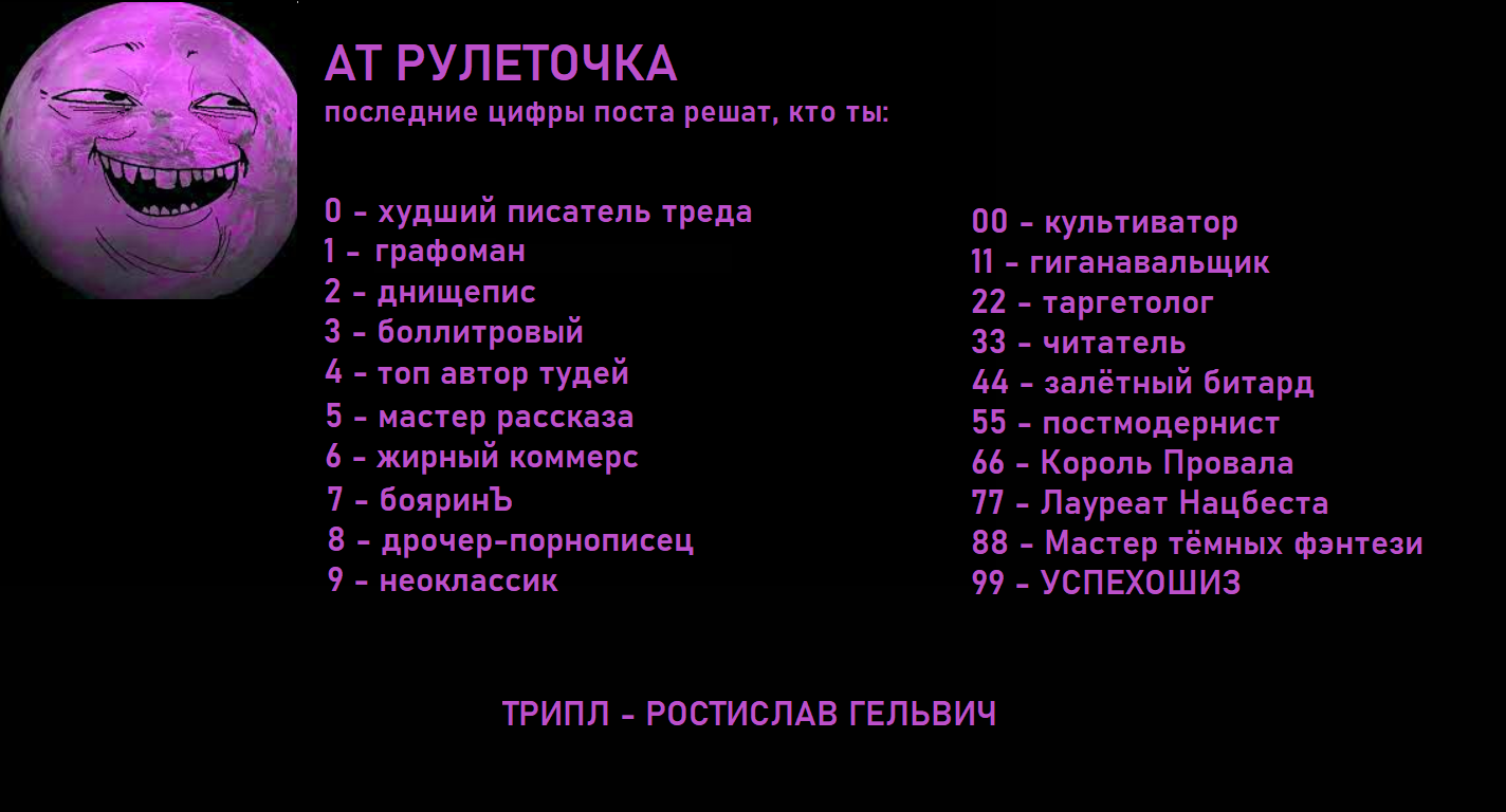 С текстами та же хуйня. Другой вопрос, что текста без ТУСОВ-ОЧКИ не существует. Вот господин критик-психиятр находит удовольствие в препарировании конкурсачеров, что уже само по себе странно, но влияет на этот конкурс гораздо больше, чем любой из присланных текстов. Потом появляются свидетели Фея, которые раздувают его миф ещё сильнее, и вот мы вместо говнописа, забывшего принять таблетки, имеем известного на всю доску (а может и за её пределами!) персонажа. Кем бы он был без вашего форса? Просто очередным невидимым набором байтов.