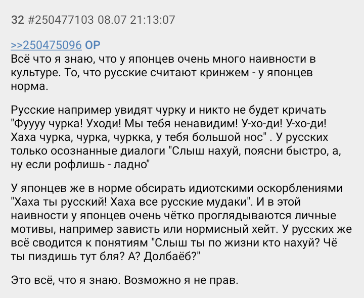 >>267913 Постоянно кекаю с кокиподобных оболтусов, что вещают со своей колокольни на весь мир. Очевидно, Коки ー просто не вписался в общество, но отвергнуть его не может. Жена русская, язык русский, НО ПОЧЕМУ-ТО живёт в Японии.