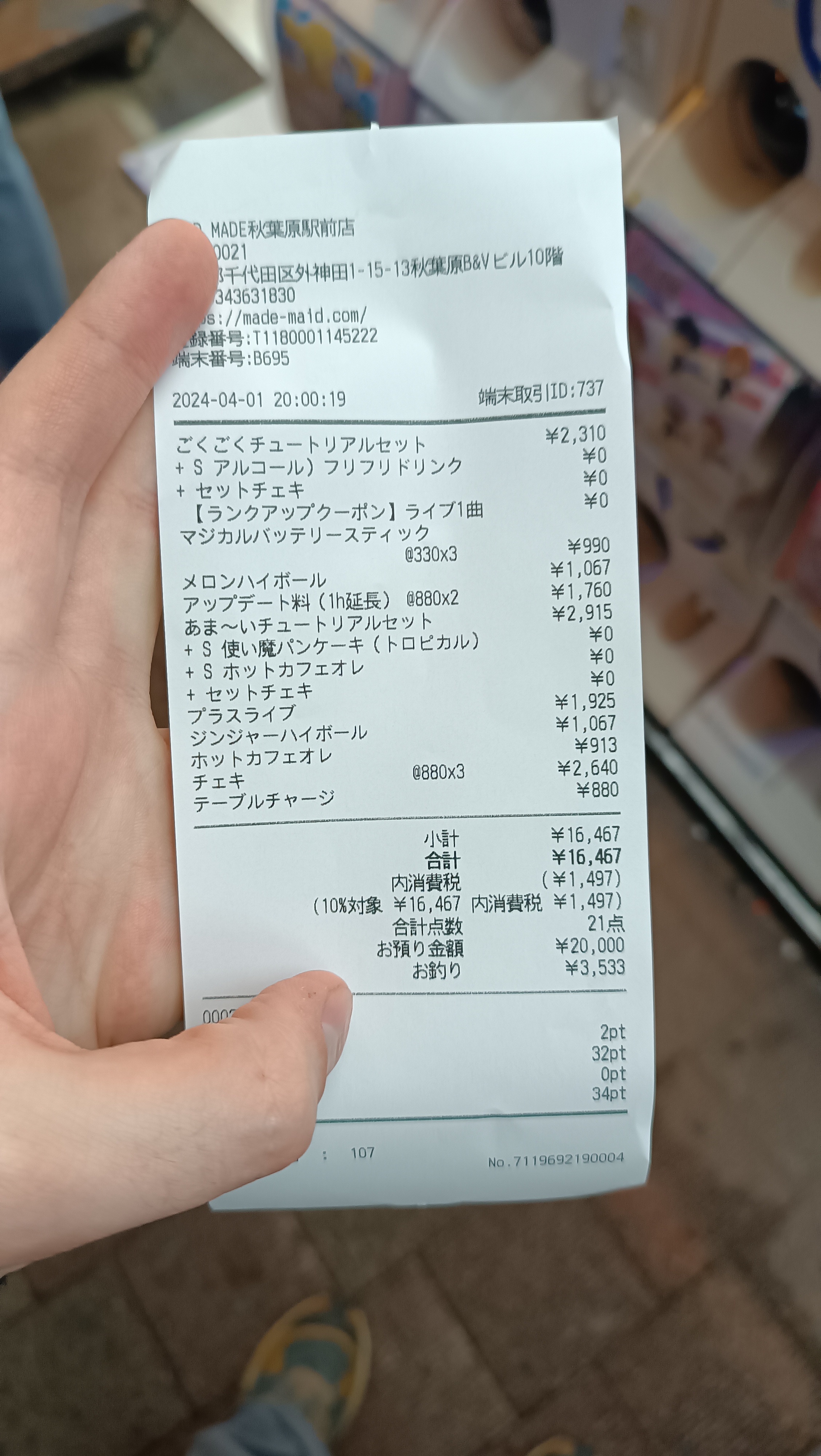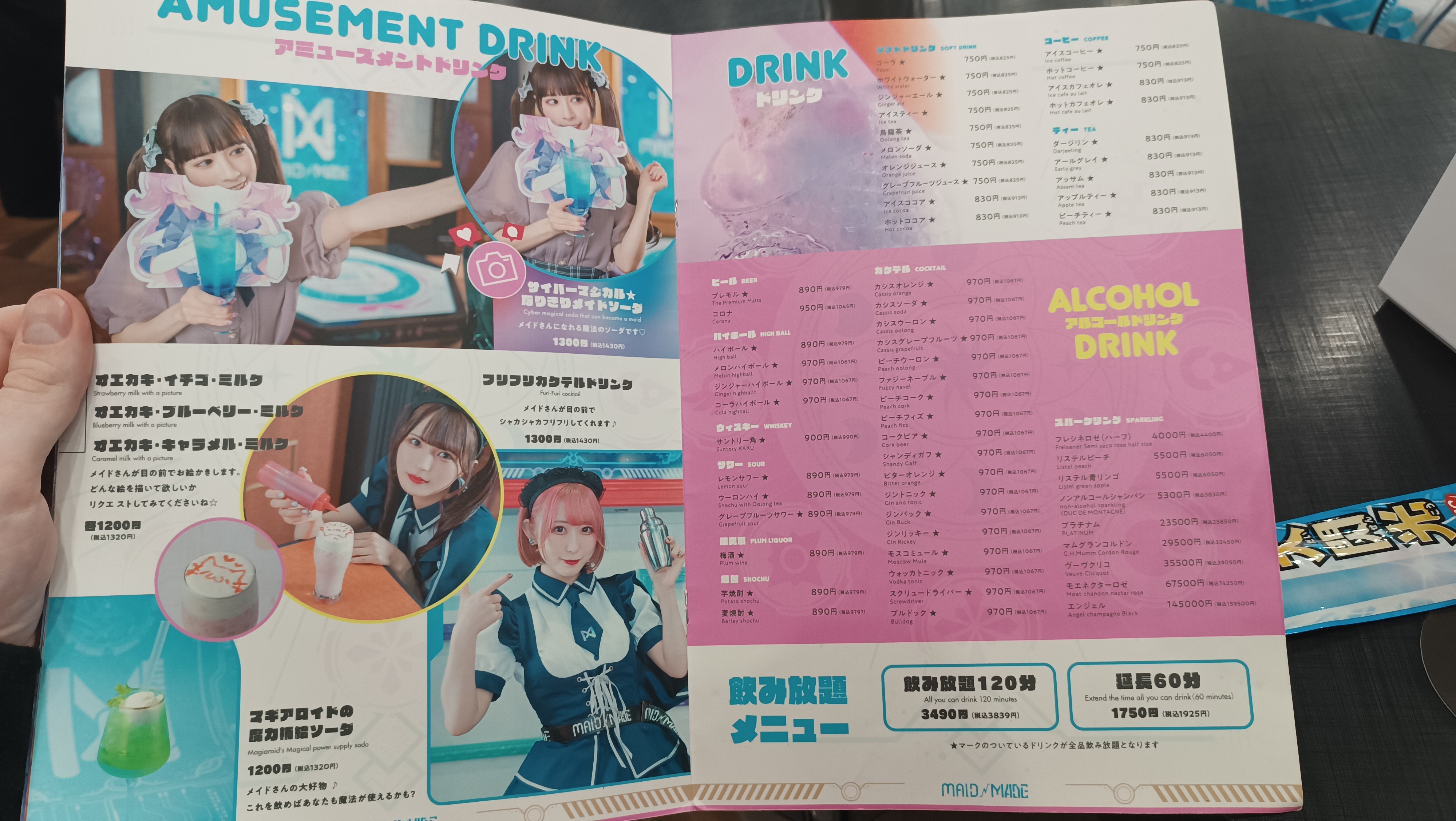 Там у них был чет типа "Мэйдо-бизнес-ланч", страницу меню с ними можно разглядеть только на этой фотке. Он стоил вроде 2650. Это, условно, база, вряд ли твой заход в мэйдошную сможет быть по чеку меньше этого, если ты не совсем на голодании.