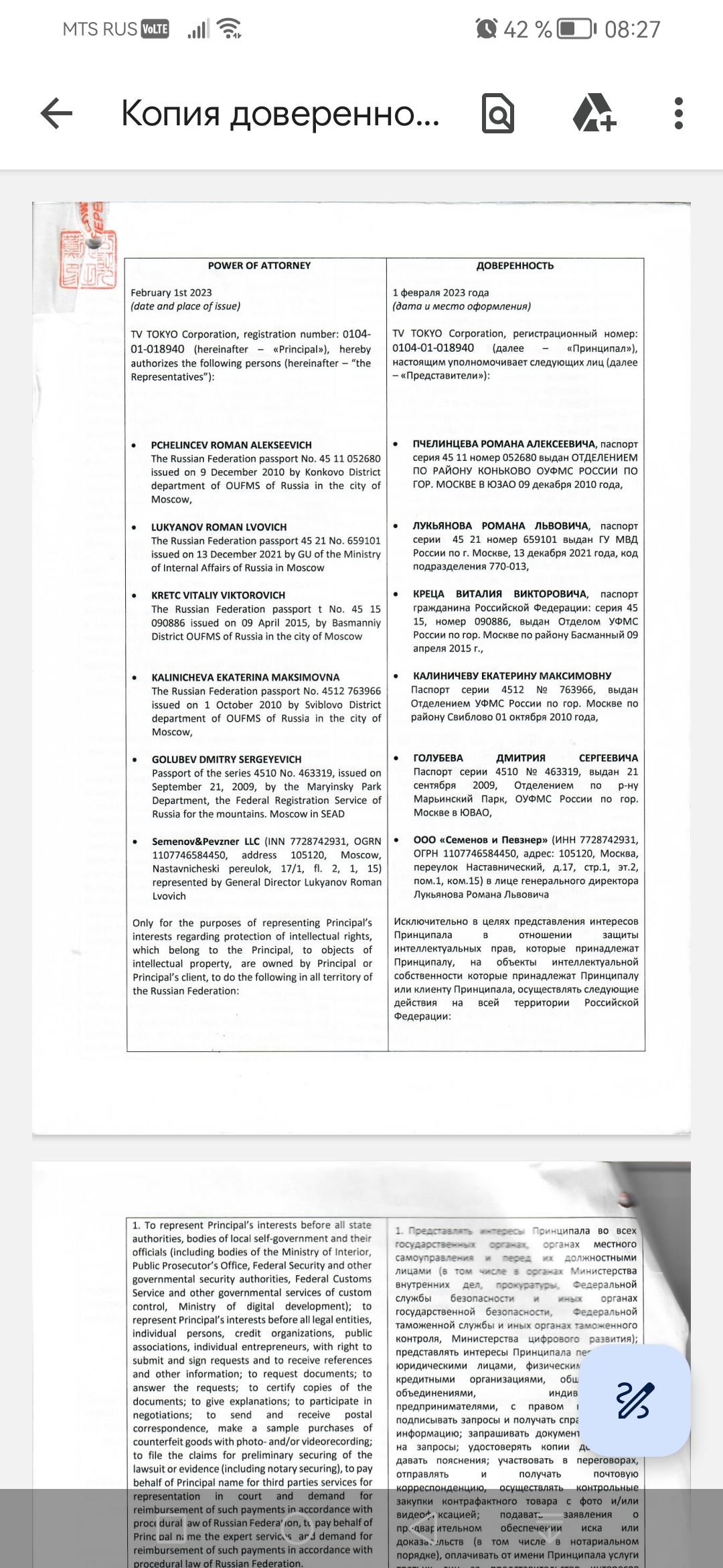 Сап, хочу обратиться к вам, анонсы-юристы и аноны, проживающие в Японии. Насколько реально обратиться к TV Tokyo corporation с просьбой проверить доверенность, якобы выданную ноунеймам в рашке на авторские права по "Наруто"? TV Tokyo corporation не отвечают на сайте, в России идет волна претензий и исков от группы юристов, наживающихся на мелких ИП. Хрен бы с ним, штрафы по авторскому праву, но не хотелось бы платить черт знает кому за маленькое изображение Наруты на наклейках по 100000 р. Нужно проверить реальна ли эта доверенность, реален ли вообще человек, выдавший ее в Японии, посредством прямого письма. Всем спасибо.
